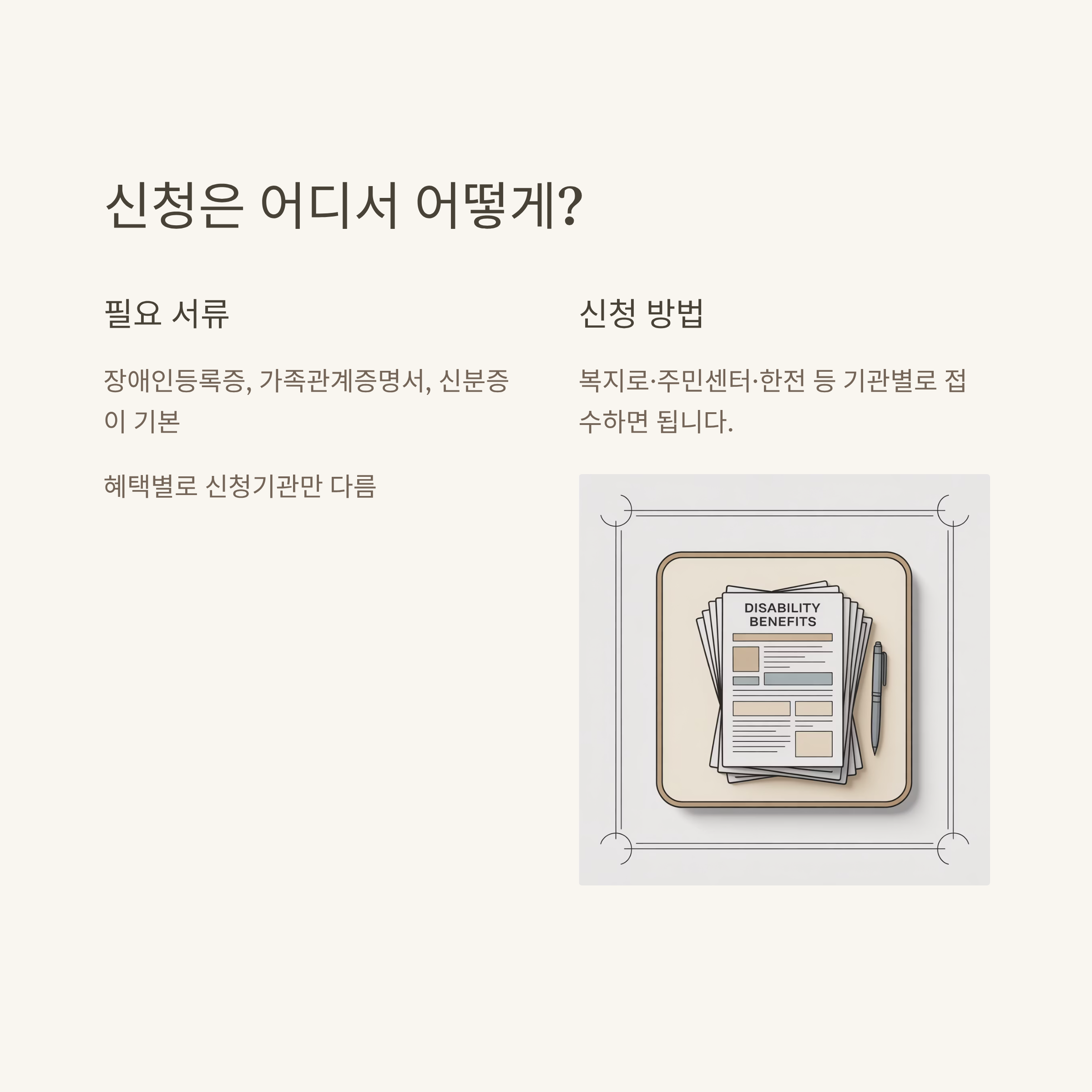 처음 장애인 등록을 할 때부터 각종 복지 혜택을 신청하는 과정까지, 처음이라면 막막할 수 있는데 실제로는 복지로, 주민센터, 각 기관 홈페이지를 잘 활용하면 크게 어렵지 않았습니다. 가장 먼저 필요한 것은 장애인등록증(복지카드), 가족관계증명서, 신분증입니다. 각 혜택(수당, 자동차, 주차, 전기요금, 문화비 등)별로 신청서 양식이 따로 있으니, 미리 해당 기관 홈페이지에서 출력해 준비하면 현장에서 빠르게 처리할 수 있습니다. 저는 복지로에서 수당 신청, 주민센터에서 자동차·전기세 감면, 시청 복지과에서 추가지원 등 각 기관별로 방문해 직접 신청 경험이 있습니다. 아래 표에 기본 신청 절차를 정리했습니다.