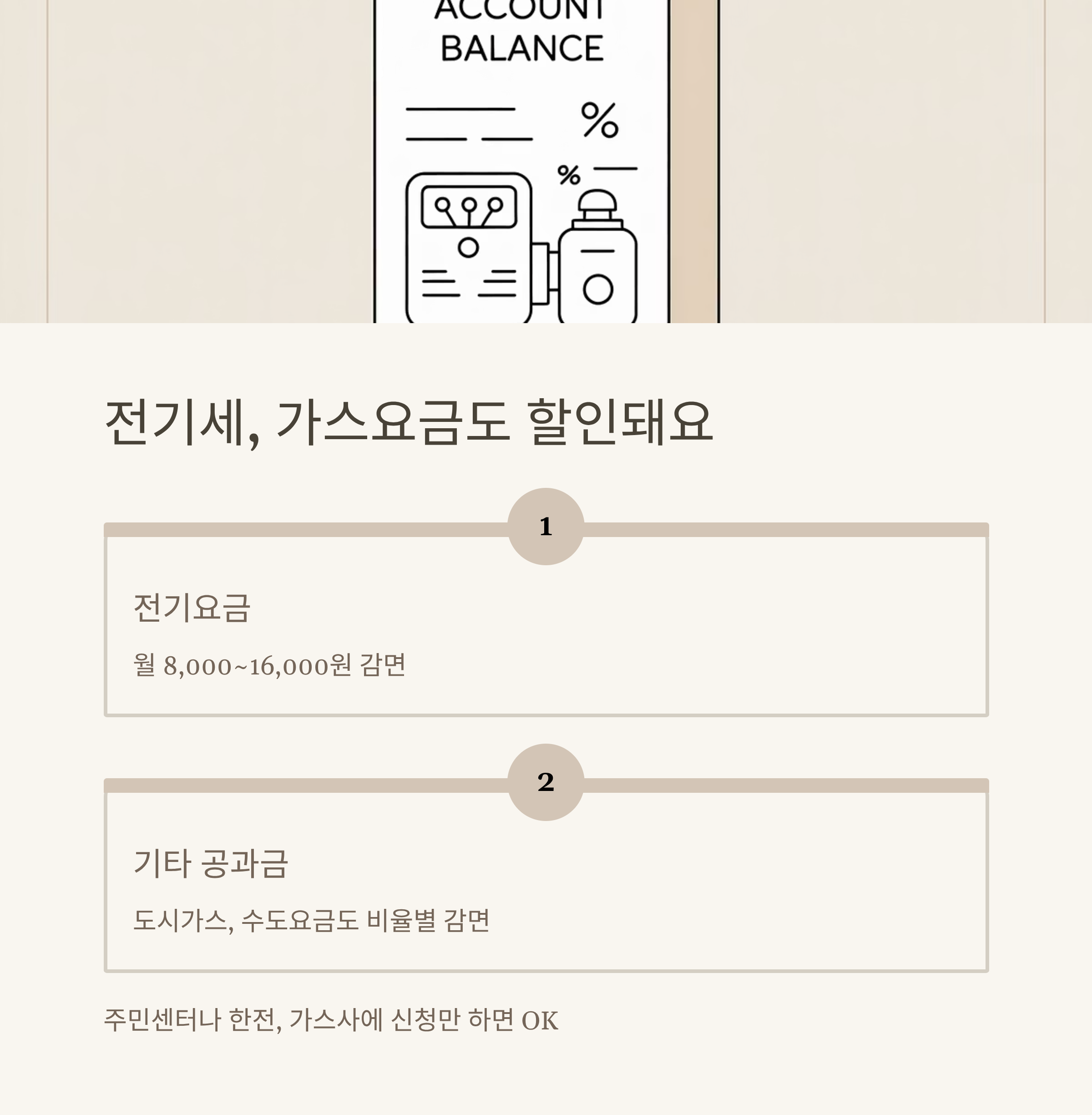 | 도시가스요금 | 5~15% 감면 | 도시가스사, 주민센터 |