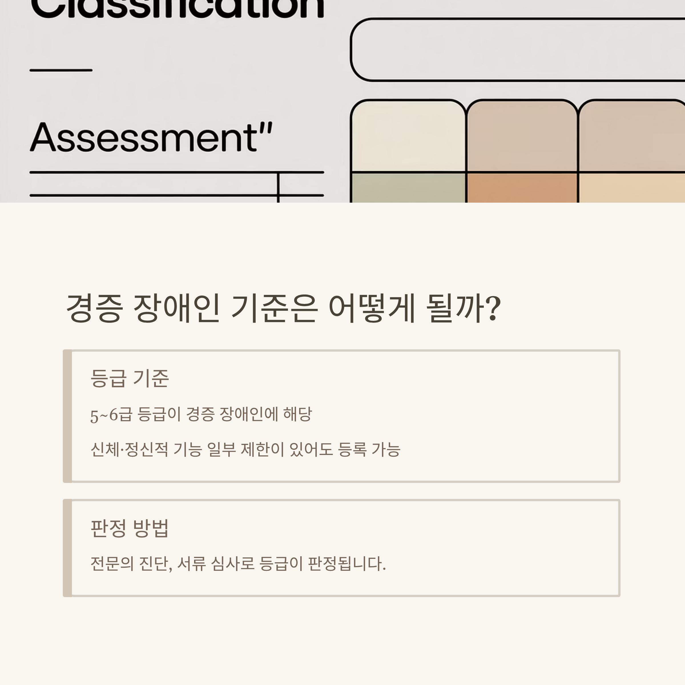 처음 경증 장애인 등록을 고민했을 때, 가장 궁금했던 것이 바로 ‘경증 장애인 기준’이었습니다. 경증 장애인은 6급, 5급 등 장애 정도가 심하지 않은 경우에 해당하는데, 신체적·정신적 기능의 일부만 제한이 있더라도 전문의 진단과 평가를 통해 공식적으로 판정받을 수 있습니다. 저는 실제로 6급 판정을 받았는데, 처음엔 어디까지가 경증 장애인인지 헷갈려서 장애인복지법 기준을 여러 번 찾아봤던 기억이 납니다.