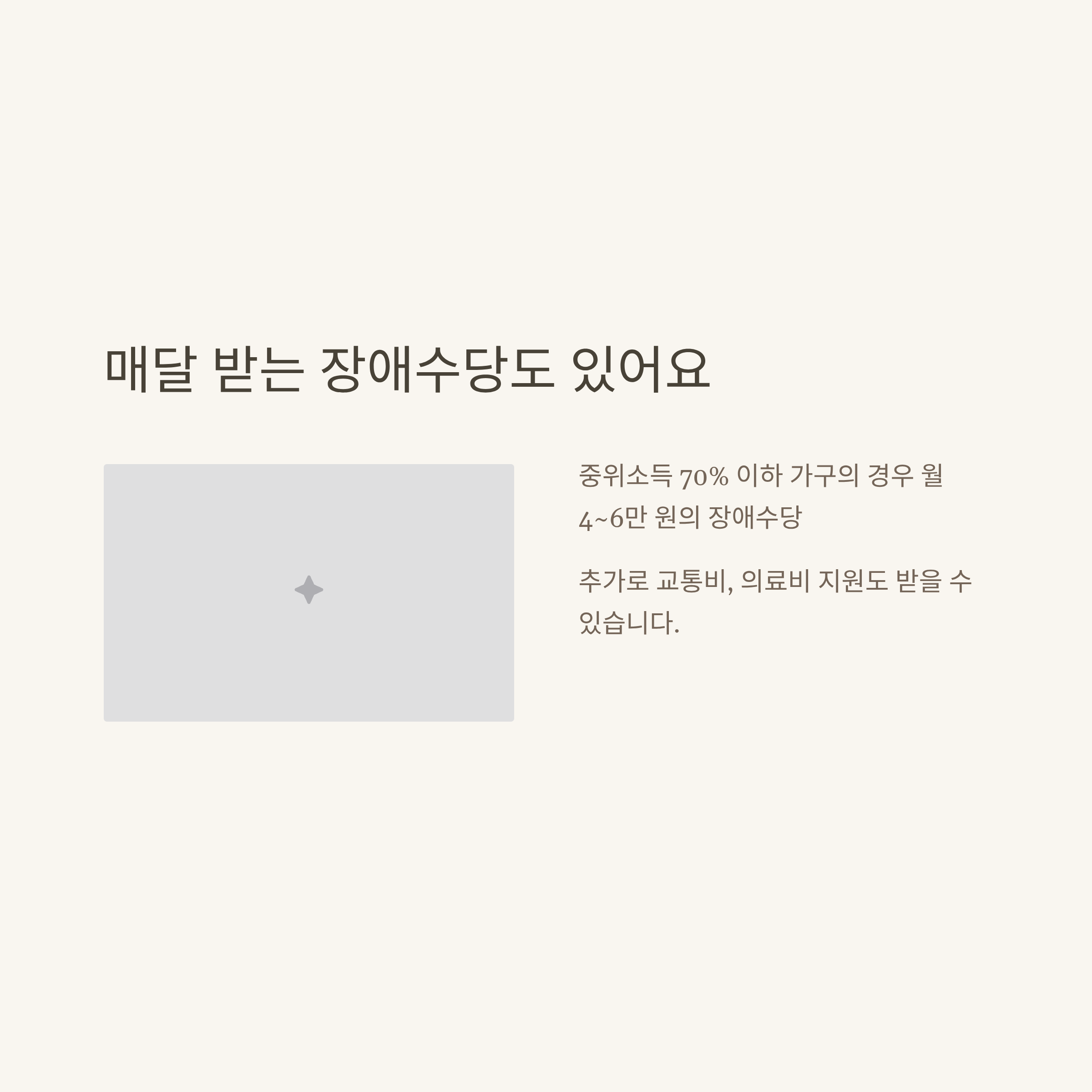 | 수당·지원금 | 장애수당, 교통비, 의료비 등 |