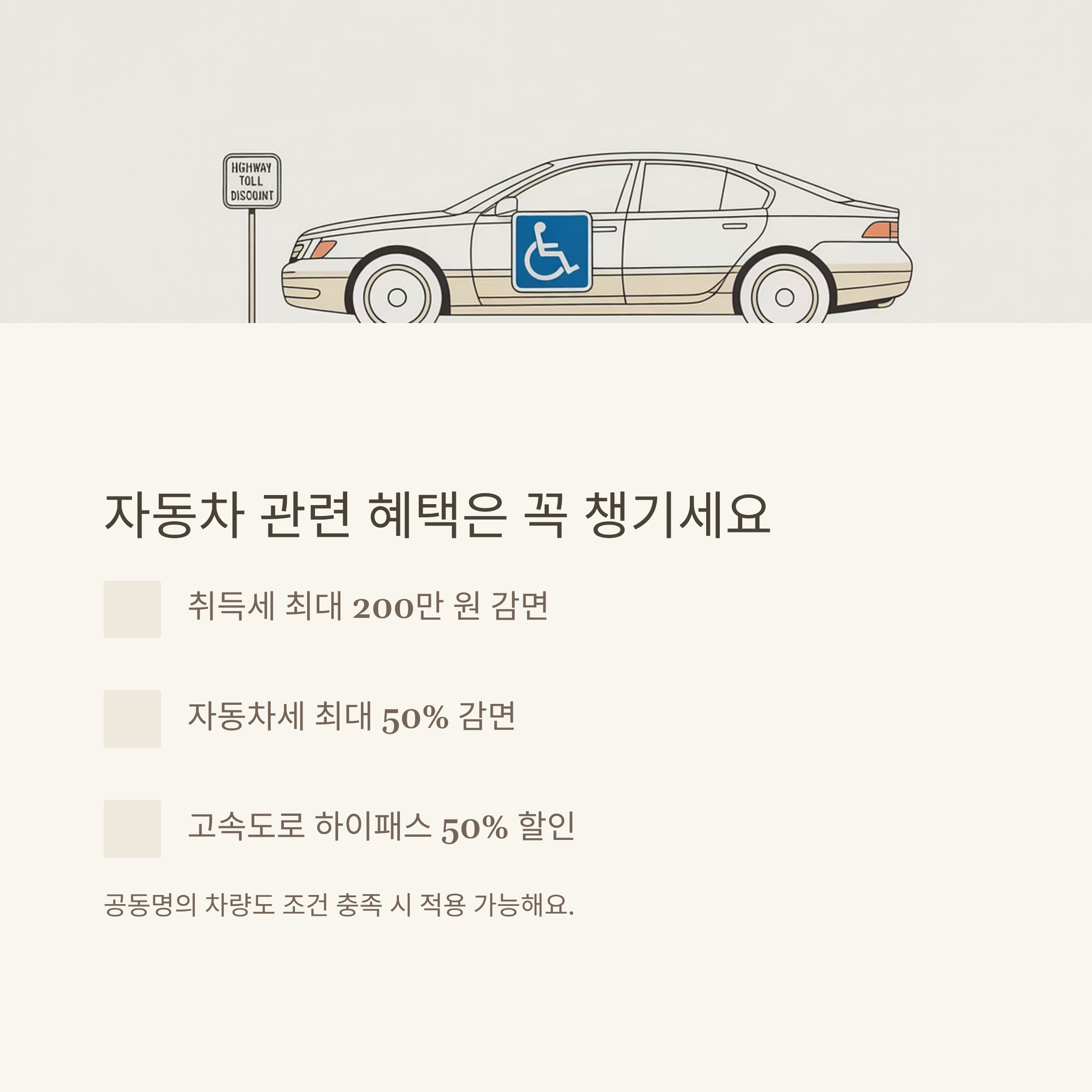 경증 장애인도 자동차와 관련한 다양한 복지 혜택을 받을 수 있습니다. 저는 경증 장애인으로 등록된 뒤 부모님 명의 차량을 공동명의로 변경해서 자동차세, 취득세, 통행료 감면을 체감할 수 있었습니다. 가장 큰 혜택은 자동차 취득세 200만원 한도 감면, 자동차세 최대 50% 감면, 하이패스/고속도로 통행료 50% 할인, 장애인 콜택시 이용권 등입니다. 단, 실제 차량을 이용하는 장애인 본인 또는 가족이어야 하며, 공동명의 또는 본인 명의로 등록해야만 감면 적용이 되니 차량 명의와 주소지, 등록 조건을 반드시 꼼꼼히 확인해야 합니다.