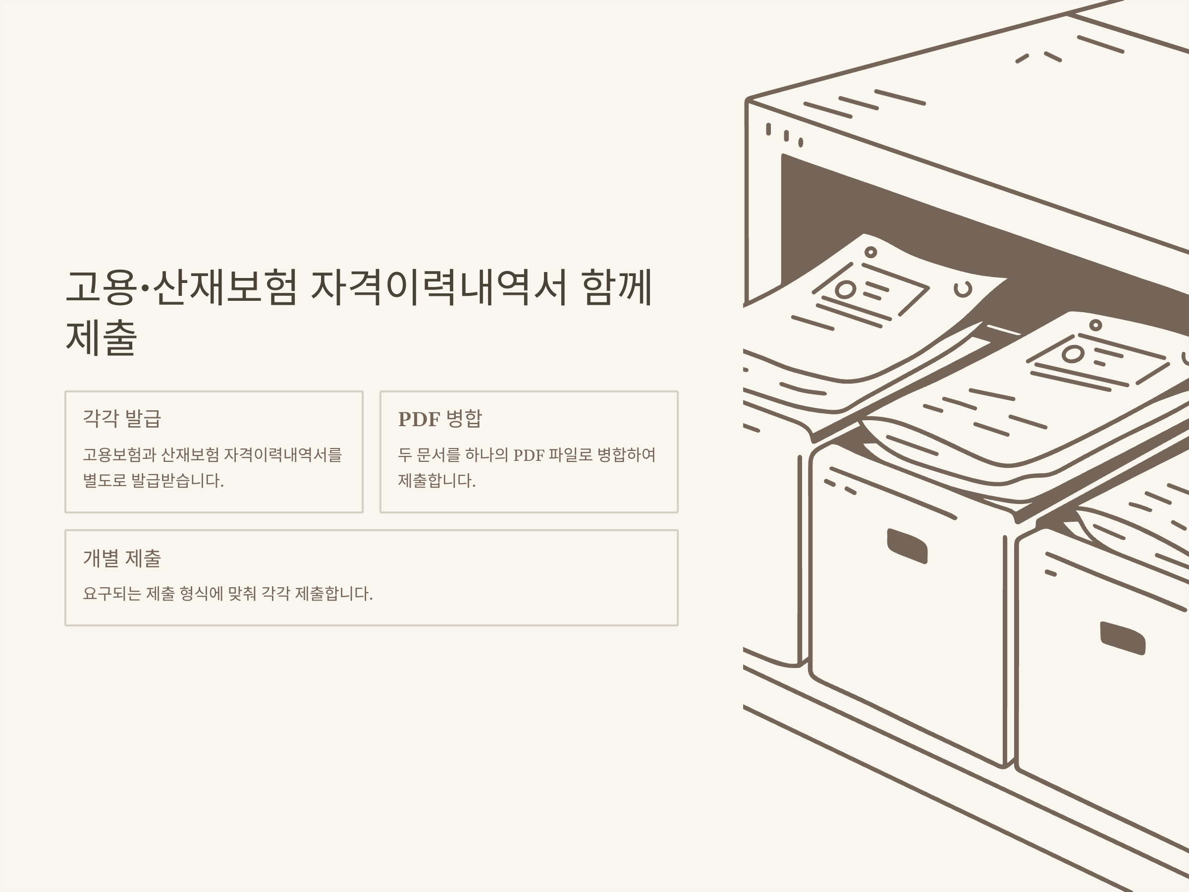 현장에서 제출 요구가 까다로운 입찰·과제·보조금 신청은 고용보험만이 아니라 산재보험 이력까지 함께 요구하는 경우가 많았습니다. 저는 처음에 고용보험 자격이력내역서만 냈다가 “산재 이력도 함께 제출” 요청을 받고 다시 발급한 경험이 있습니다. 효율적인 순서는 이렇습니다. 먼저 고용보험에서 자격이력내역서를 발급한 뒤, 근로복지공단 민원 메뉴에서 산재 관련 자격·이력 문서를 추가로 뽑아 한 파일로 병합합니다. 기관에 따라 명칭을 ‘고용산재보험 자격이력내역서’로 통칭하지만, 실제로는 각각 별도 문서인 점을 유의해야 합니다. 전자제출이 가능하면 각 문서 하단의 진위확인번호로 검증하므로 인쇄 없이도 접수가 매끄럽게 진행됐습니다.