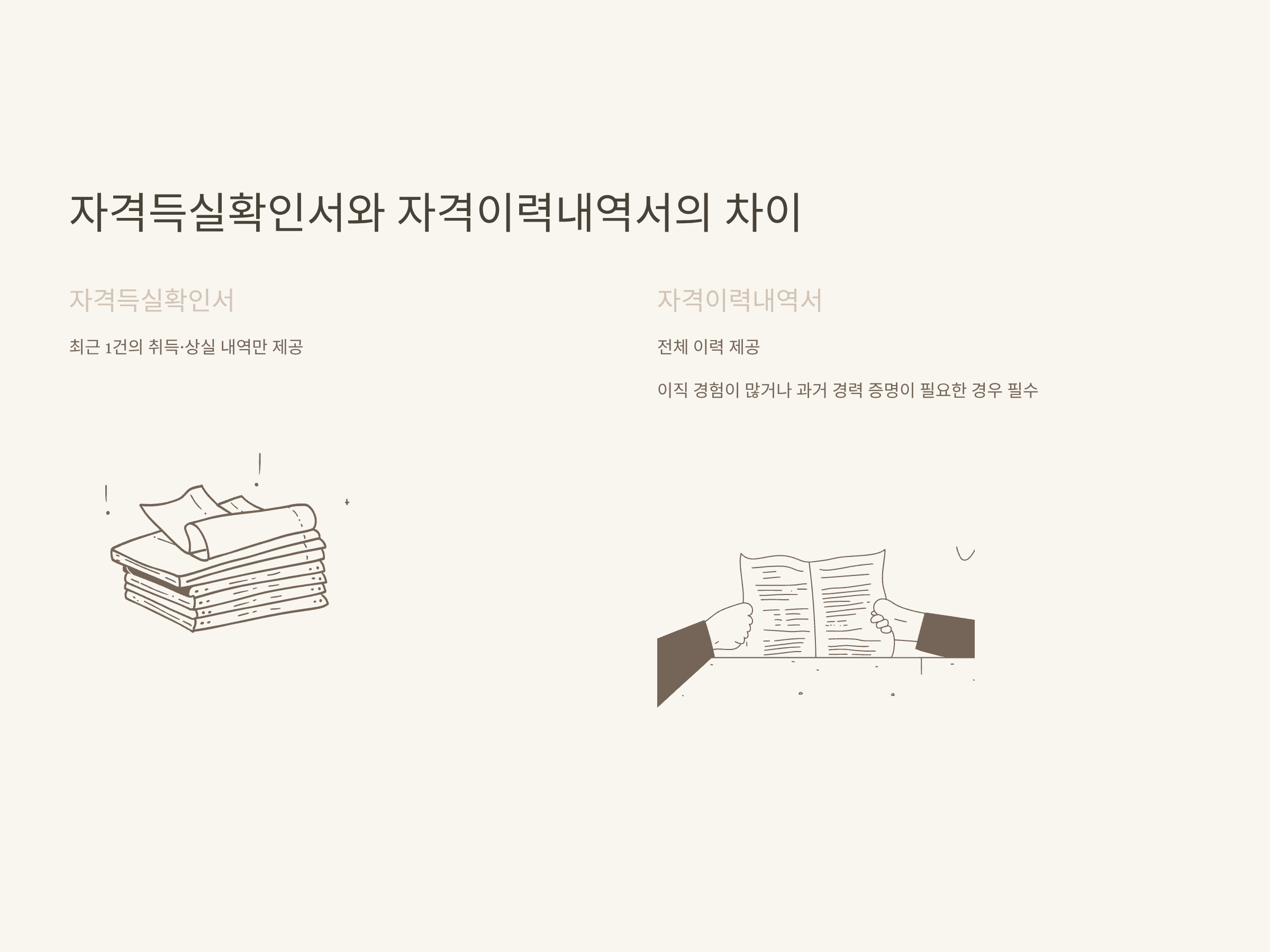 많은 분들이 자격이력내역서와 자격득실확인서를 혼동합니다. 자격득실확인서는 현재 재직 여부를 포함한 최근 1건의 취득·상실 정보를 확인하는 서류입니다. 반면 자격이력내역서는 과거 전체 이력을 확인할 수 있어 더 상세합니다. 예를 들어, 저는 3번 이직한 이력이 있어 자격이력내역서를 제출해야만 했습니다.