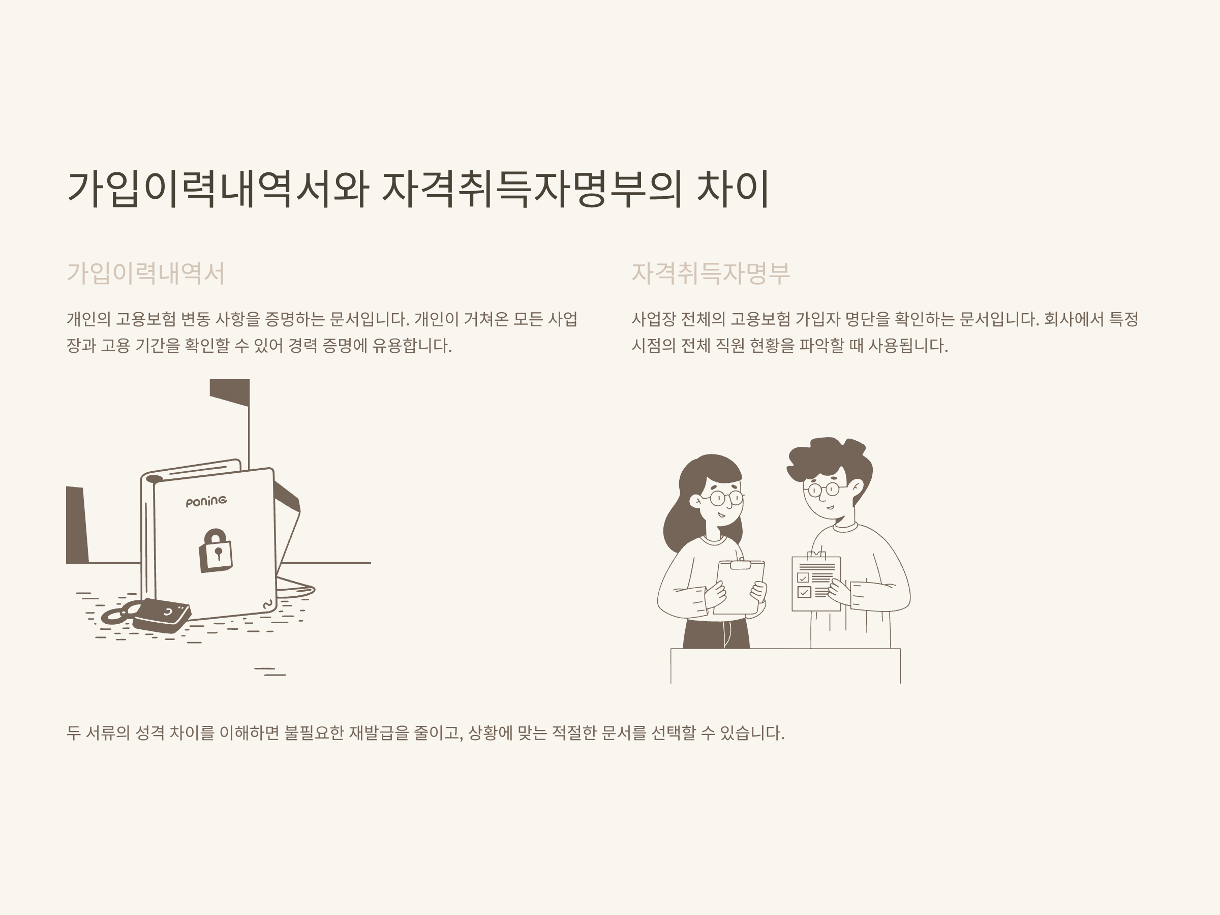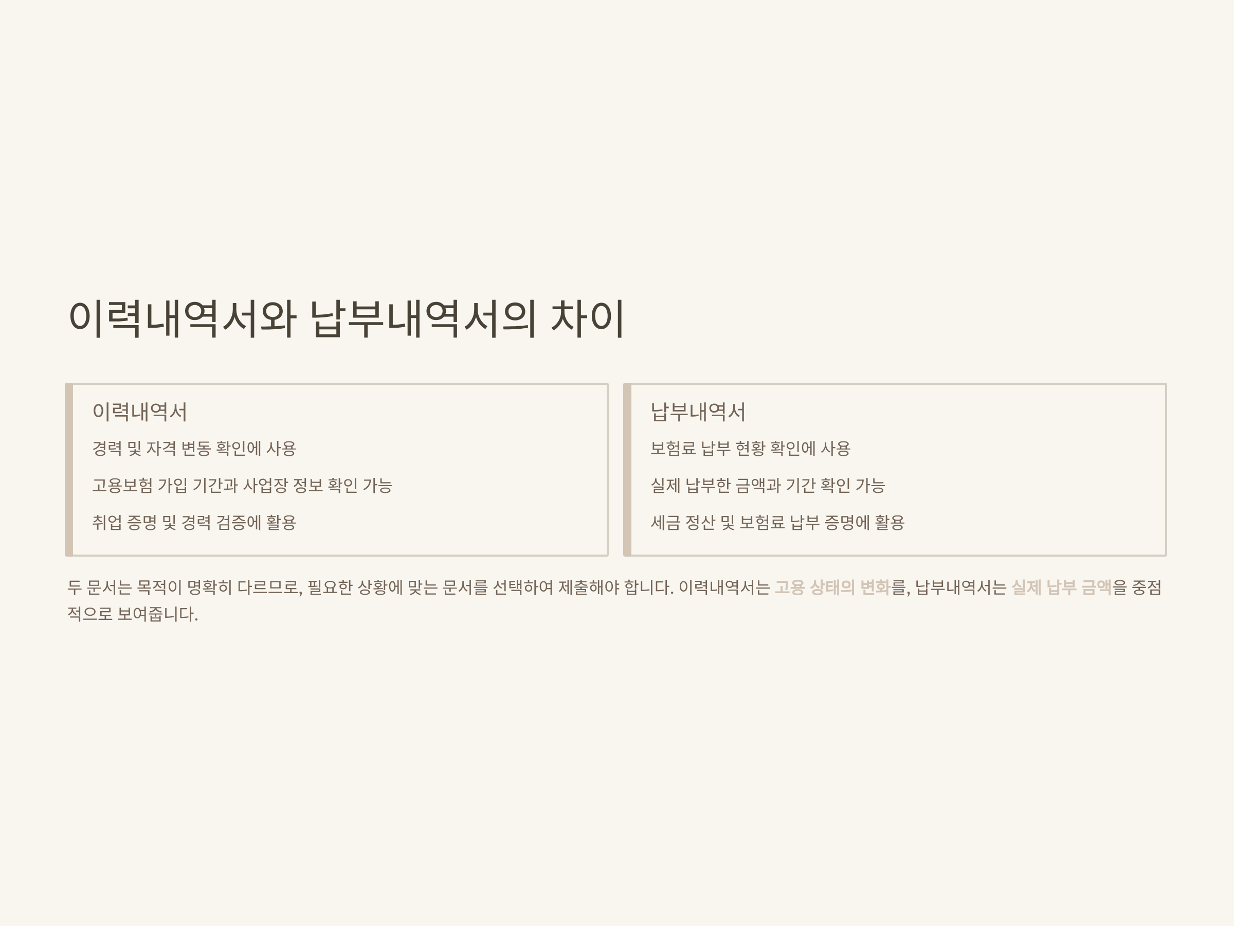 | 주 사용처 | 경력 검증, 실업급여 심사 | 금융 심사, 정산·분쟁 |