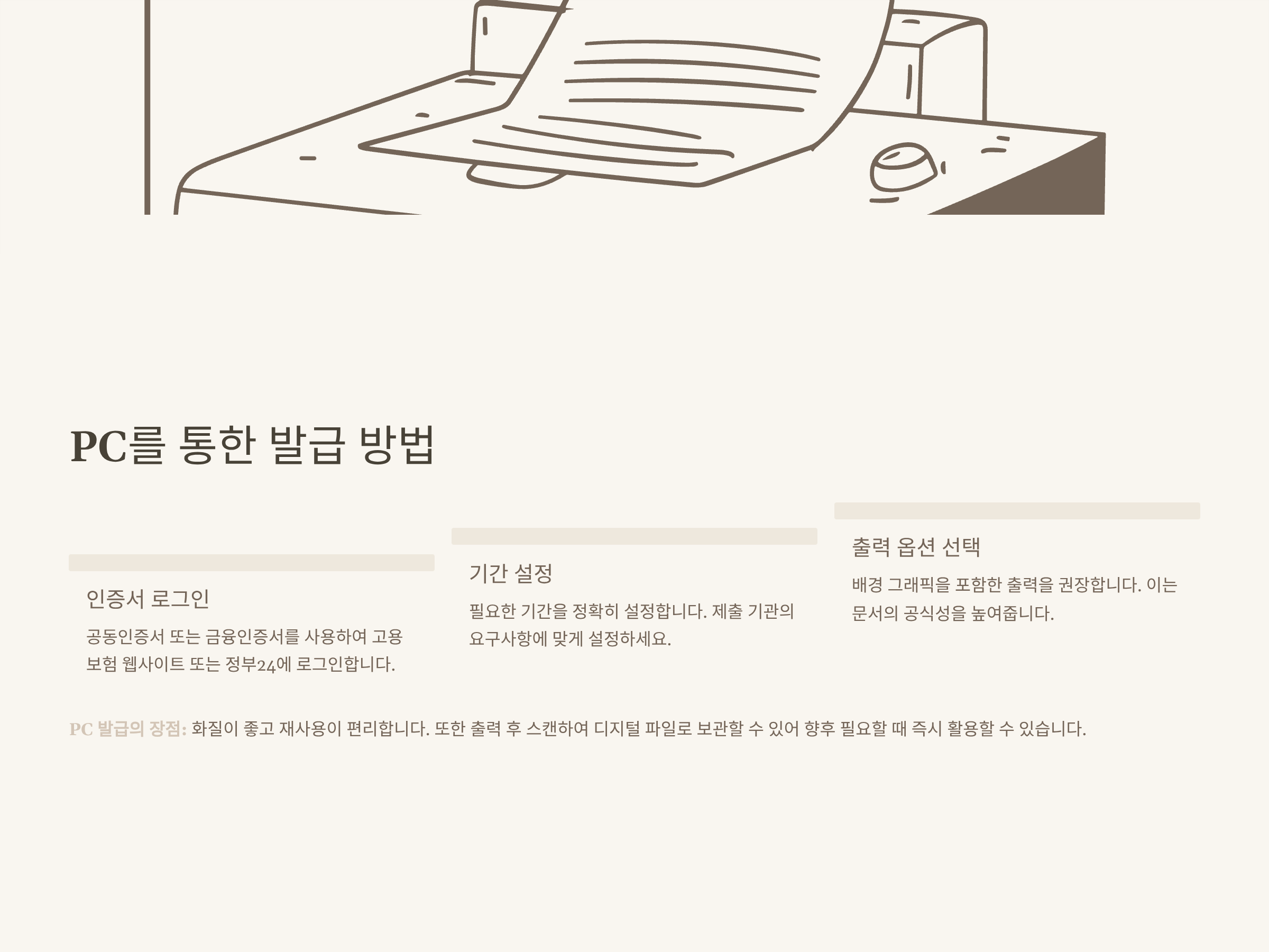 | 온라인 | 고용보험 / 정부24 | 즉시 발급, PDF 저장·진위확인 | 본인 인증 수단 필요 |