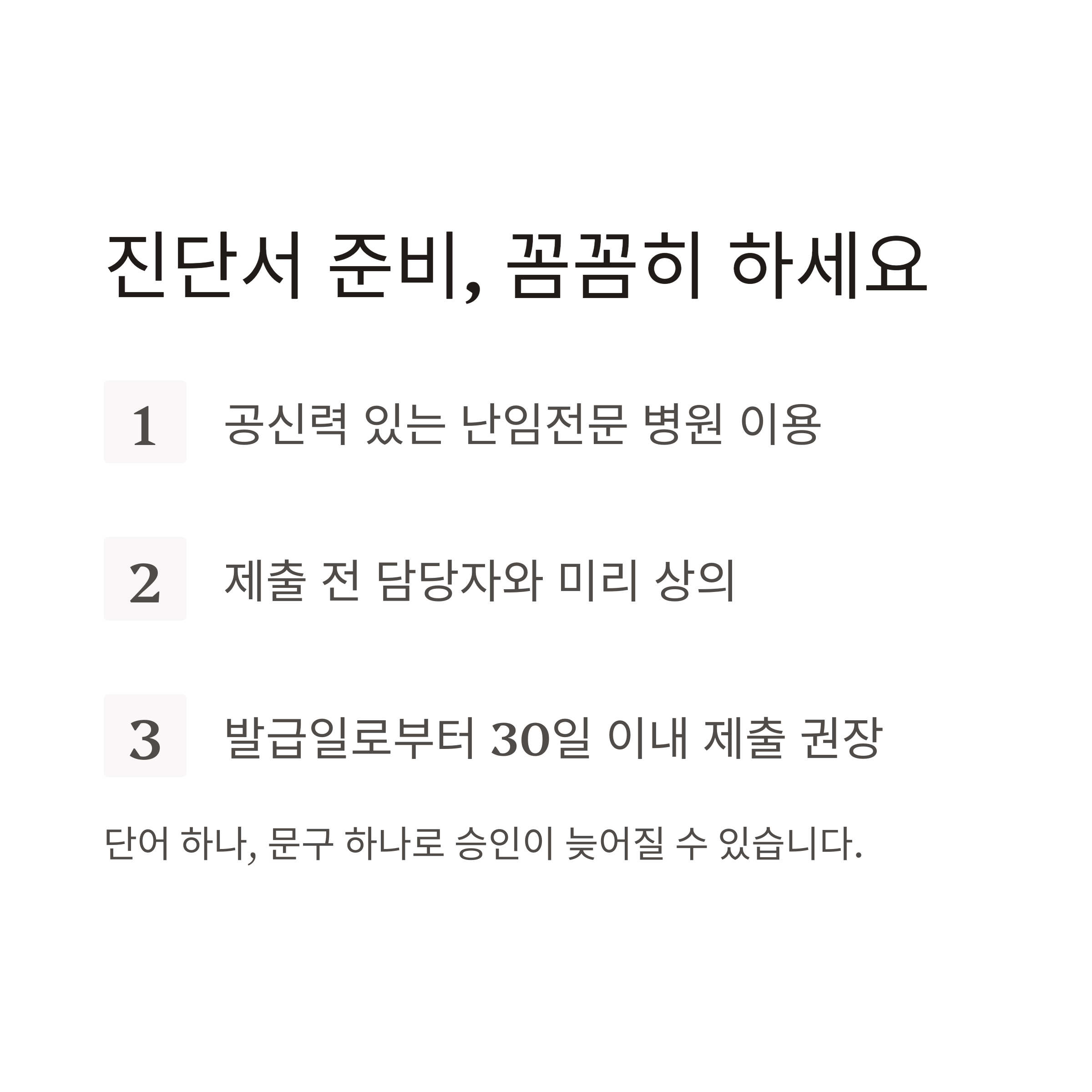 - 진단서 필수: 산부인과 또는 비뇨기과 전문의가 발행한 ‘난임 진단서’ 제출