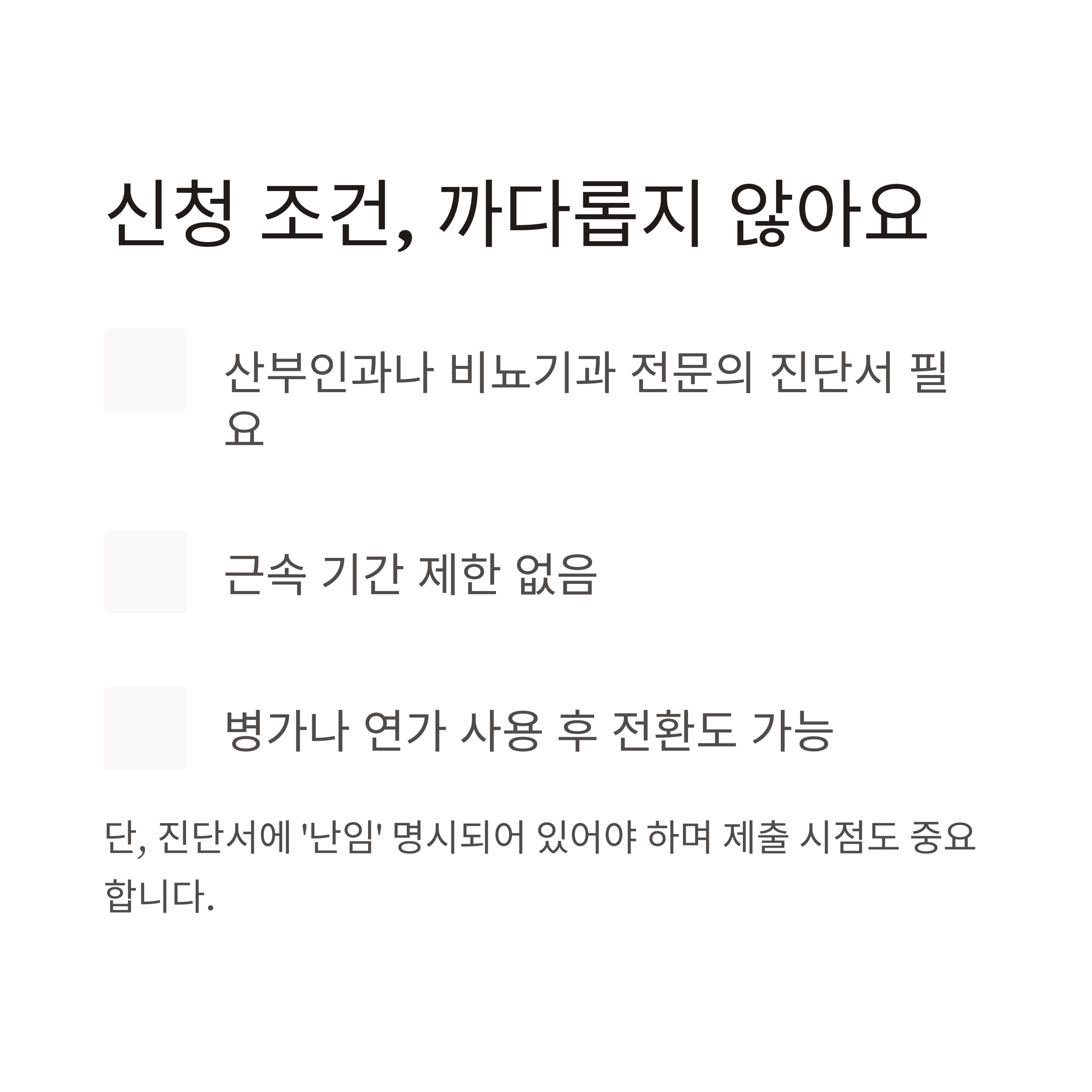 저는 난임휴직을 고민하면서 가장 먼저 ‘조건이 까다롭지는 않을까?’라는 걱정이 컸습니다. 결론부터 말씀드리면, 산부인과에서 난임 진단을 받고 진단서를 발급받는 것이 가장 핵심 요건이었어요.