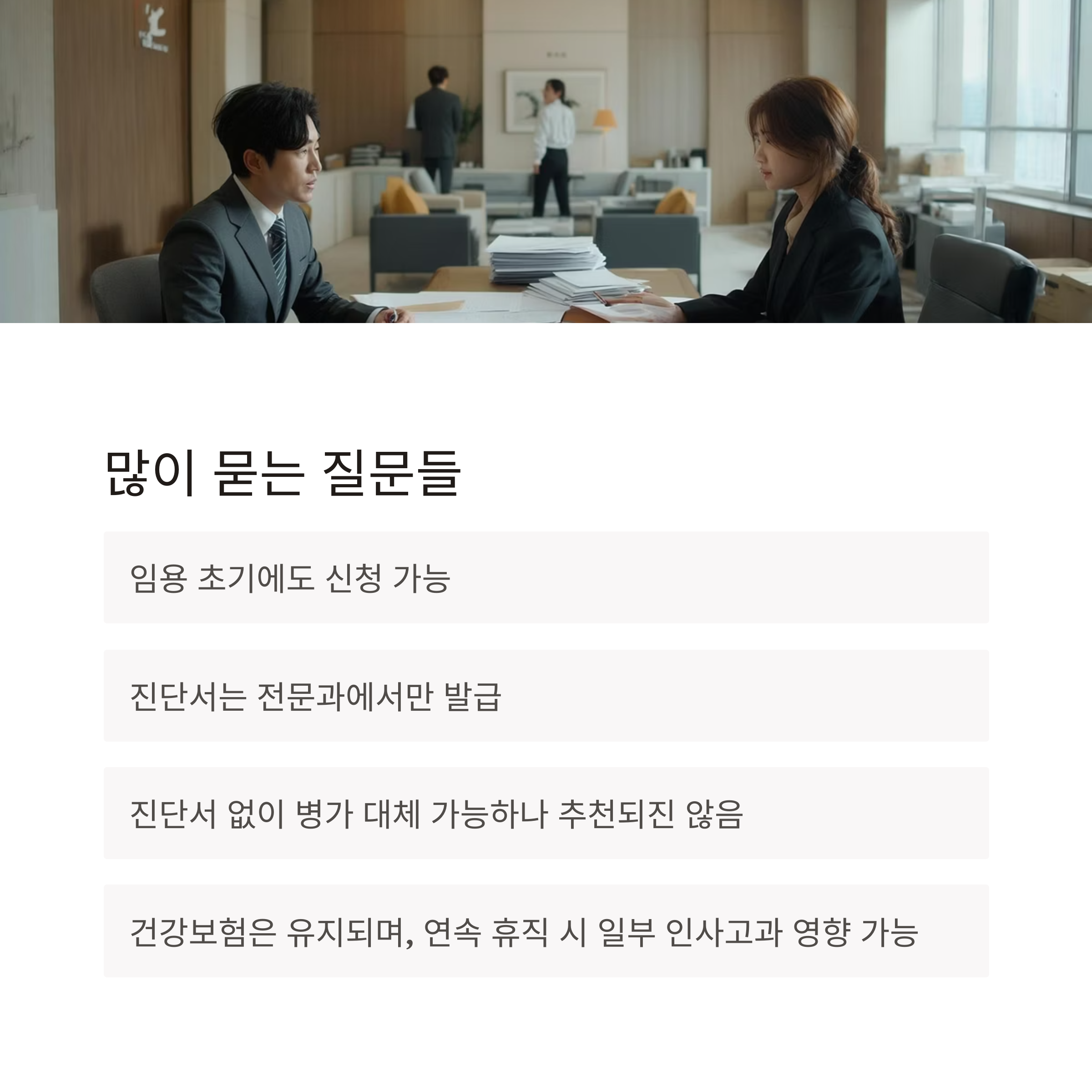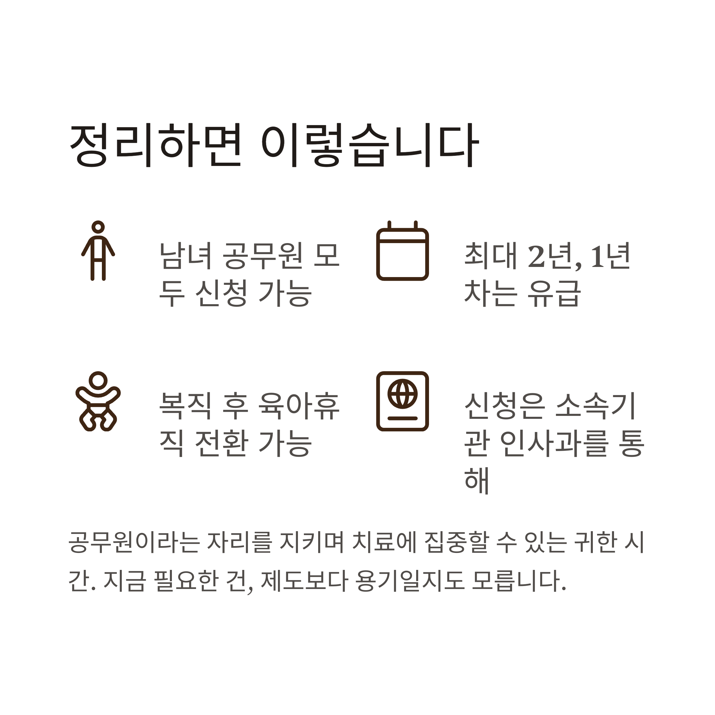 저 역시 ‘신분 유지하면서 치료를 위한 시간 확보’가 필요했기에, 이 제도의 존재를 알게 되고 신청하려는 결심을 할 수 있었습니다.