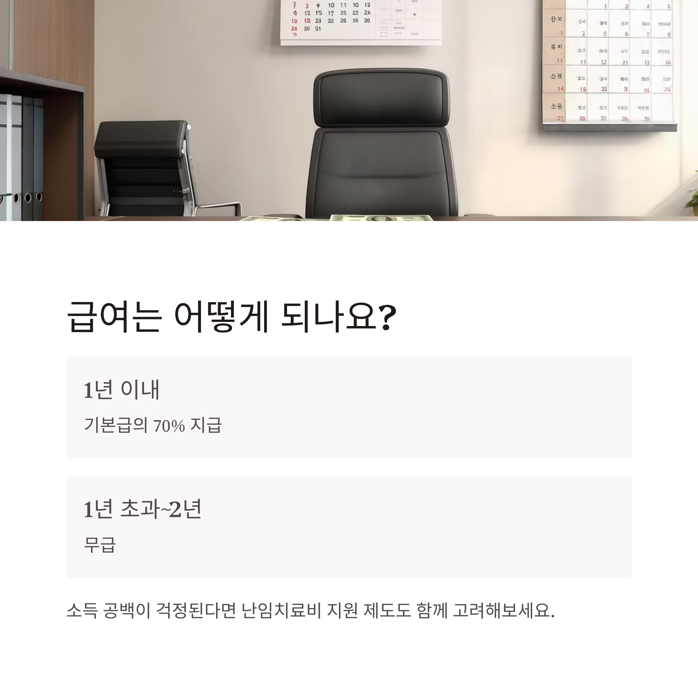 | 급여 기준 | 1년차 70% 지급 / 2년차 무급 |