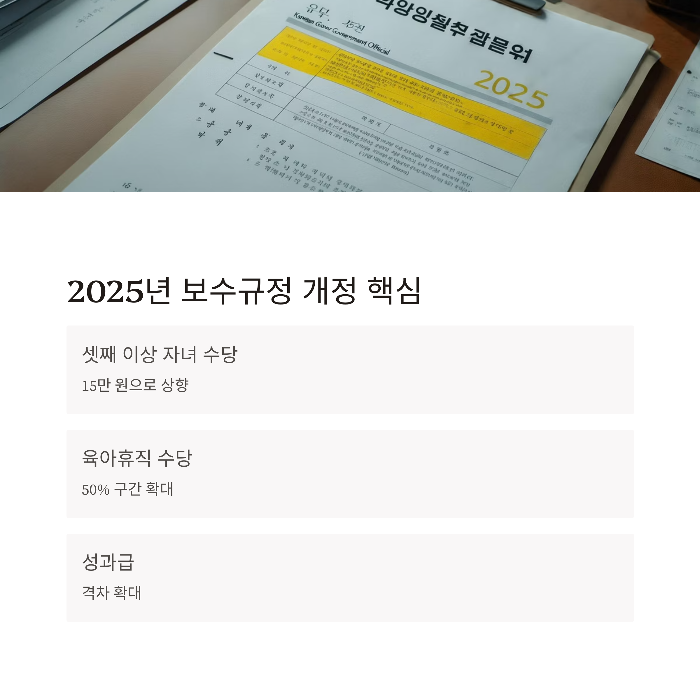 2025년 개정안에선 특히 **성과급과 가족수당, 육아휴직 수당** 기준이 조정됐습니다. 저 역시 보수관련 커뮤니티에서 이 소식을 접하고 ‘드디어 현실 반영이 되었구나’ 싶었죠.