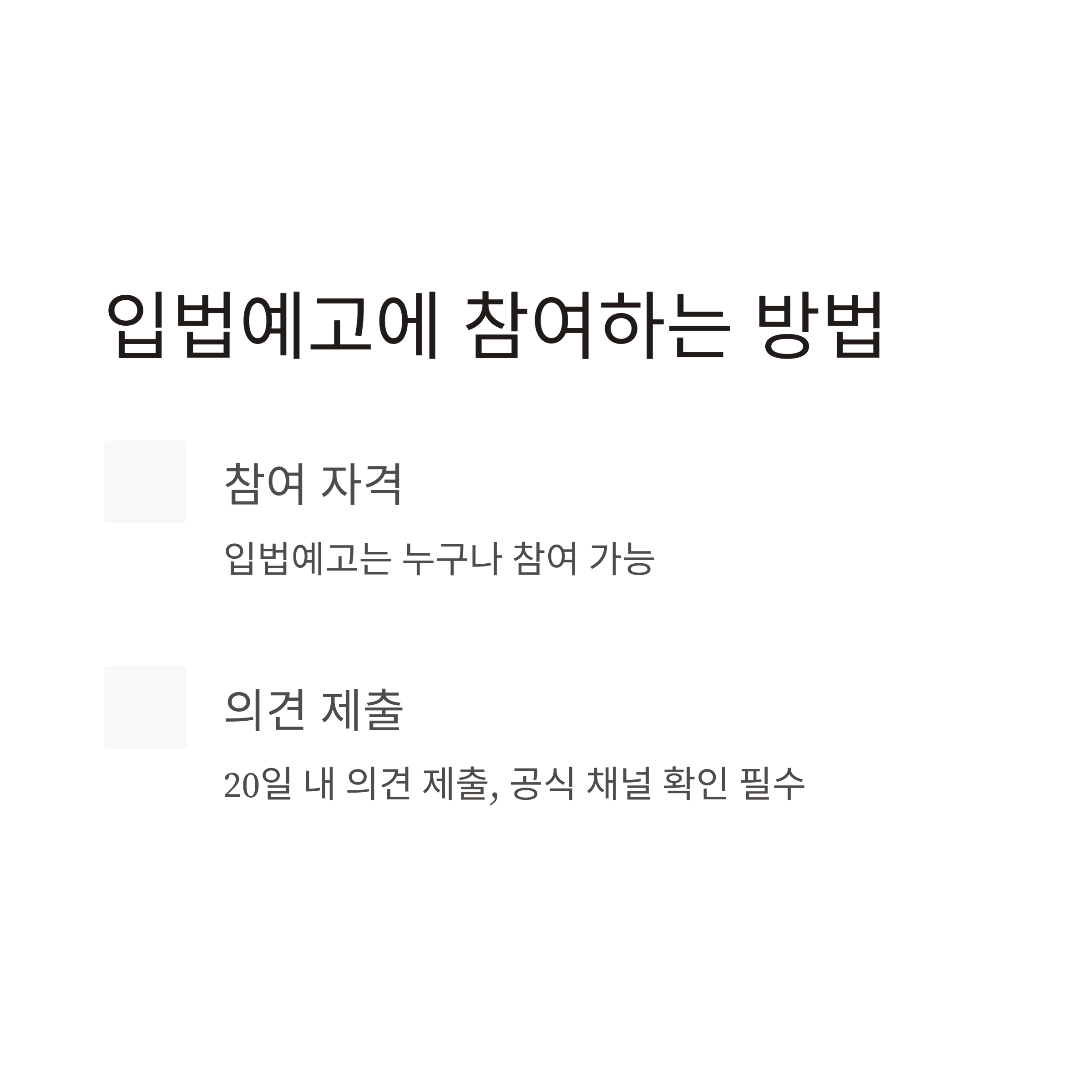 | 입법예고 | 누구나 참여 가능 | 20일 이내 의견 제출 필수 |