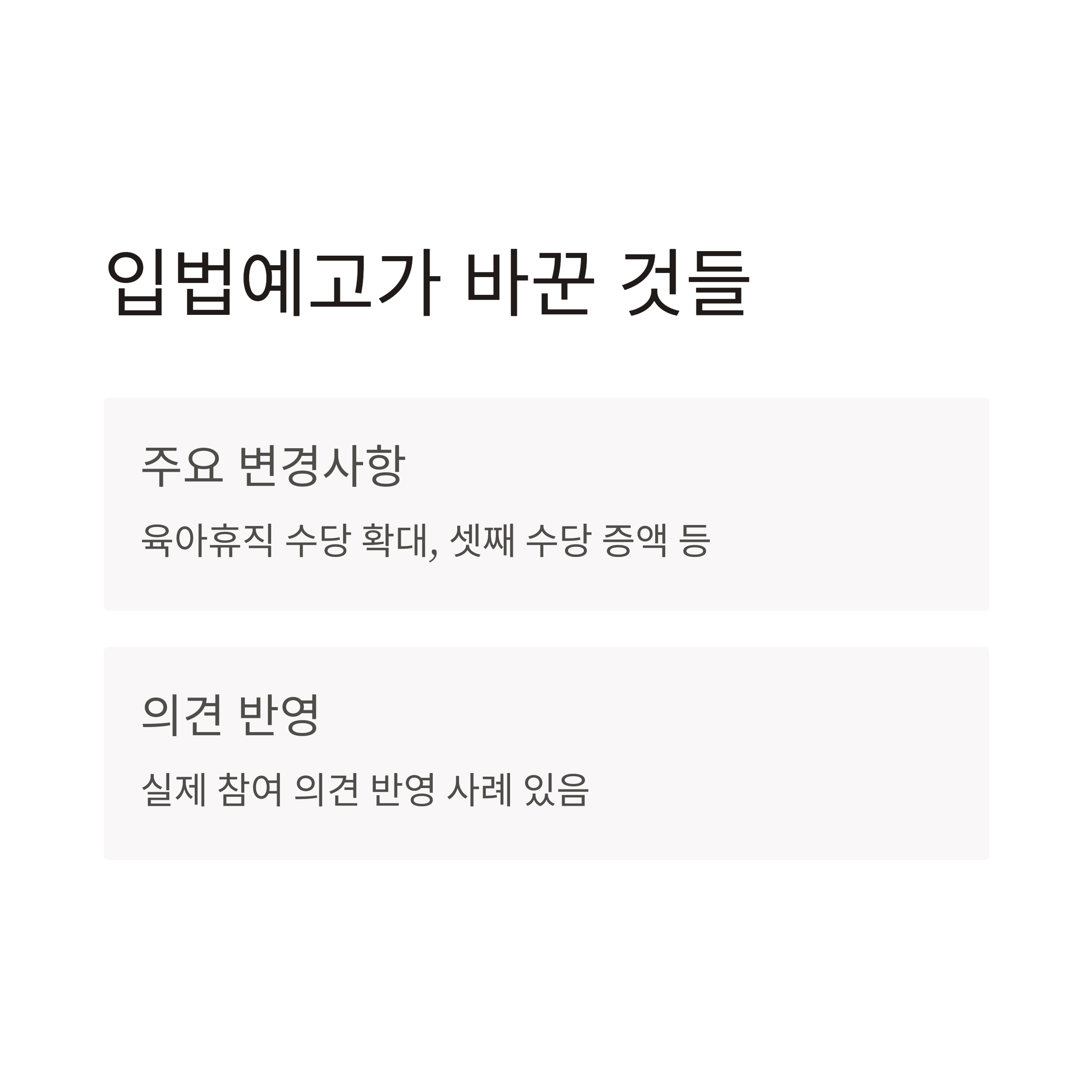 2024년 저는 ‘육아휴직 수당 연장 요청’을 입법예고에 제출했고, 현장 의견이 절반 이상 반영되어 2025년 개정안에 반영된 사실을 확인했어요. 이 사례는 의견 제출이 단순 참여가 아니라 실제 정책으로 이어질 수 있다는 걸 보여줍니다.