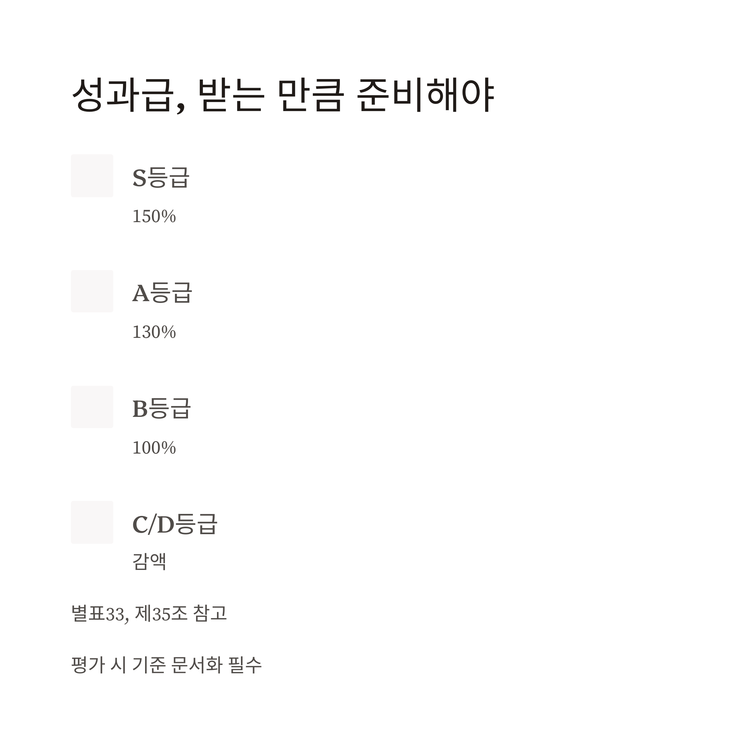 | 성과급 | A등급 최대 150%, C·D는 감액 | 평가기준 사전 공유 필수 |