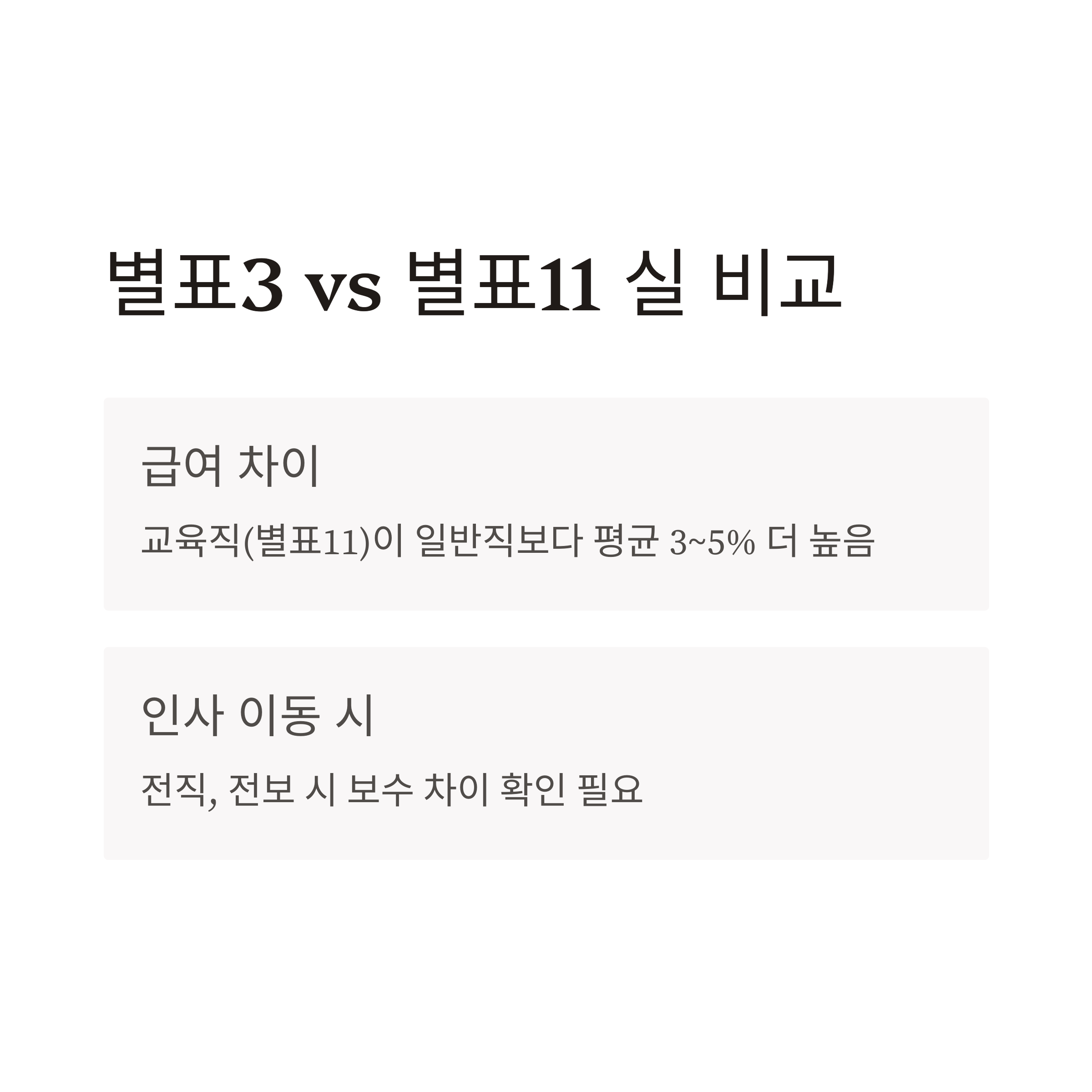 별표3(일반직)과 별표11(교육직)은 비슷해 보이지만, 실제로는 **호봉 간 급여 격차**가 분명합니다. 제가 학교 행정실 업무를 맡다가 일반직으로 전환된 적이 있는데, 동일 호봉이어도 별표11 쪽이 3~5% 더 많더라고요.
