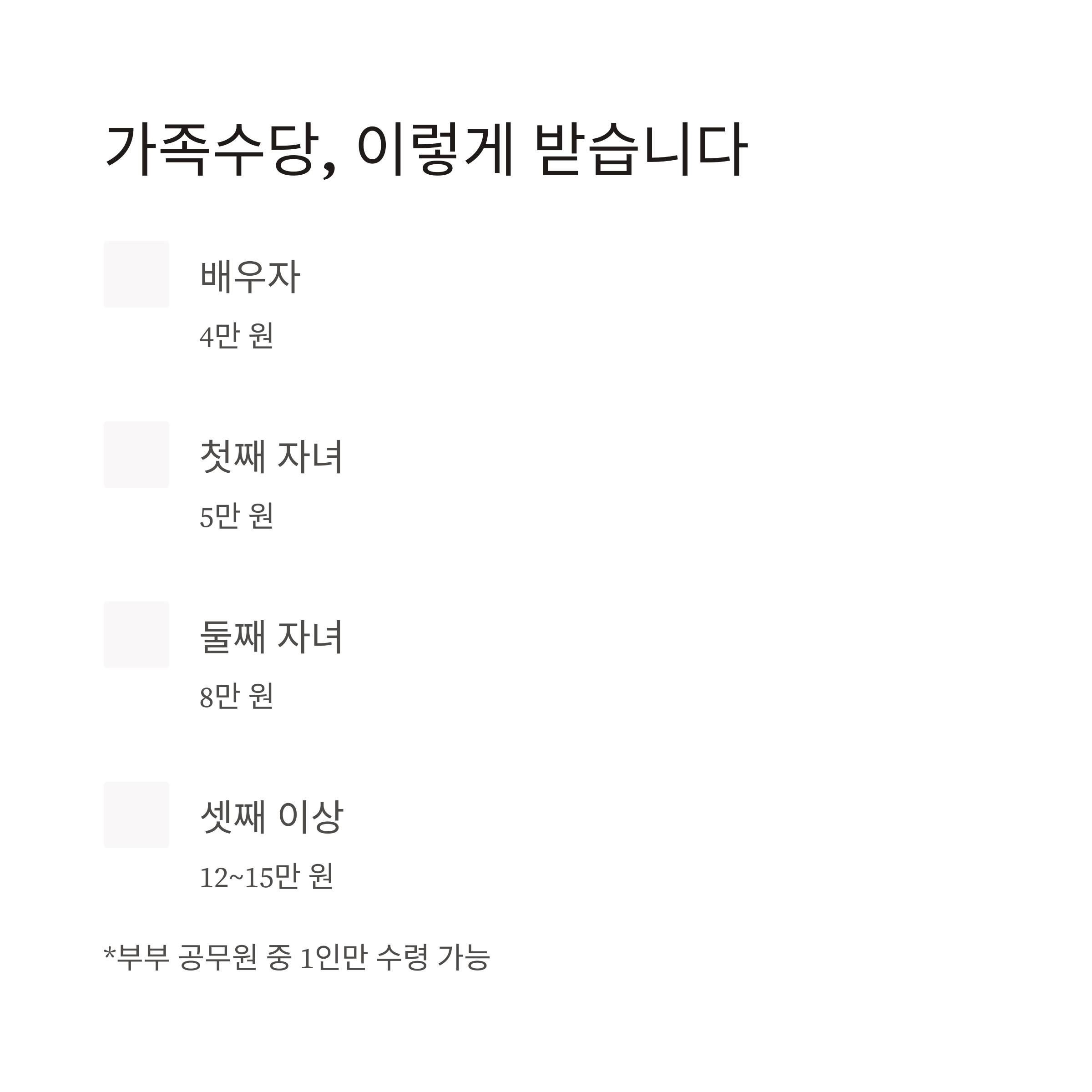 - 가족수당: 셋째 이상 자녀 수당 15만 원으로 상향