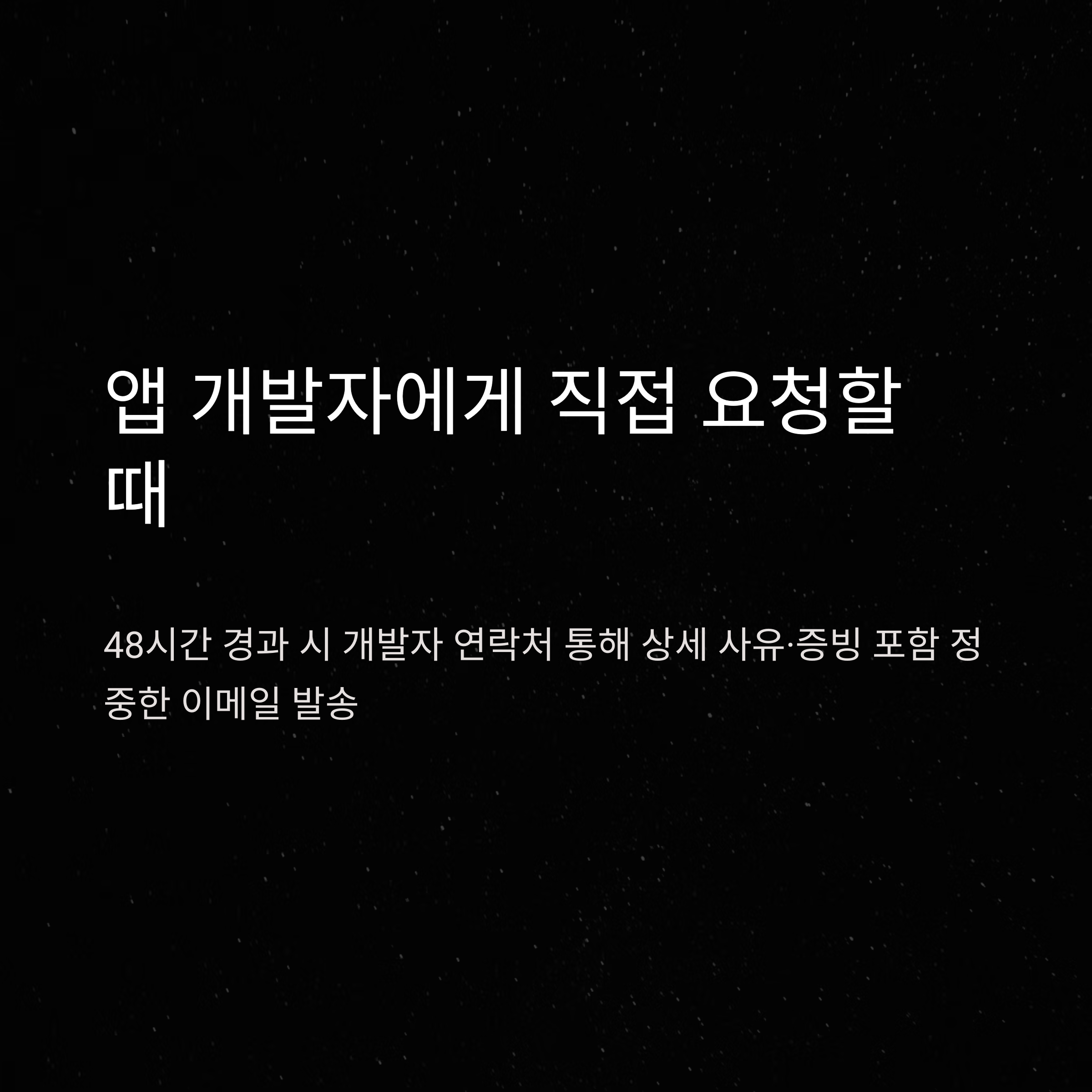 | 48시간 초과 | 앱 개발자에게 직접 요청 | 환불 보장 불가 |