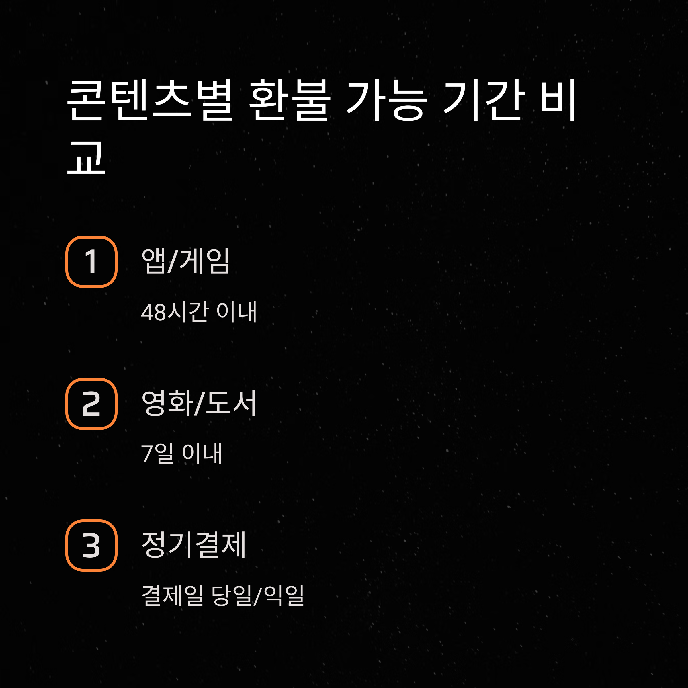 | 앱/게임 | 결제 후 48시간 이내 | 2시간 이내는 즉시 환불 가능 |