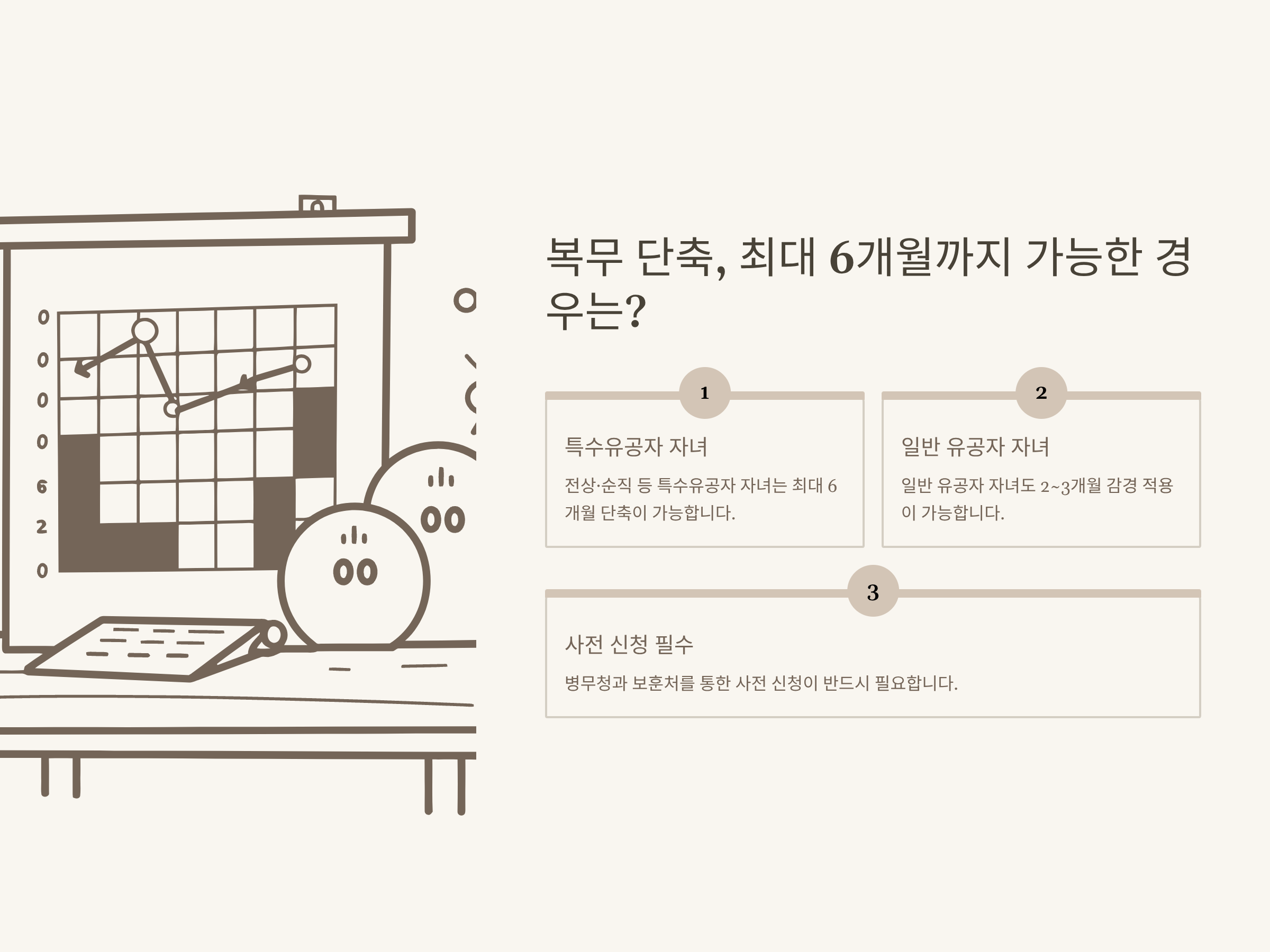 일반적으로 보훈대상자 자녀라면 복무 단축 혜택(최대 6개월 감경)이 적용될 수 있는데, 이는 병무청과 보훈처가 지정한 등급, 가족상황, 복무 희망 분야 등 여러 조건을 충족해야 합니다. 실제로는 대부분 2~3개월 복무 단축 혜택이 일반적이고, 6개월 감경은 특별법 적용 대상만 가능합니다.