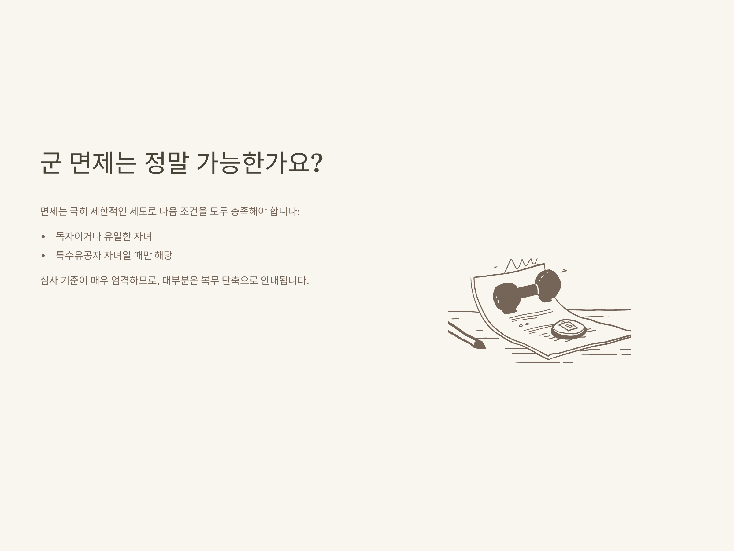 군 면제 혜택은 전상·순직 등 ‘특수 유공자’의 유일한 자녀, 가족 내 독자 등 특별한 조건이 있을 때만 병무청 개별 심사 후 적용이 가능합니다. 제가 직접 상담했던 보훈지청에서도 “면제는 아주 엄격하게 심사하며, 일반적인 유공자 자녀는 복무 단축만 가능하다”고 명확하게 안내해주셨습니다.