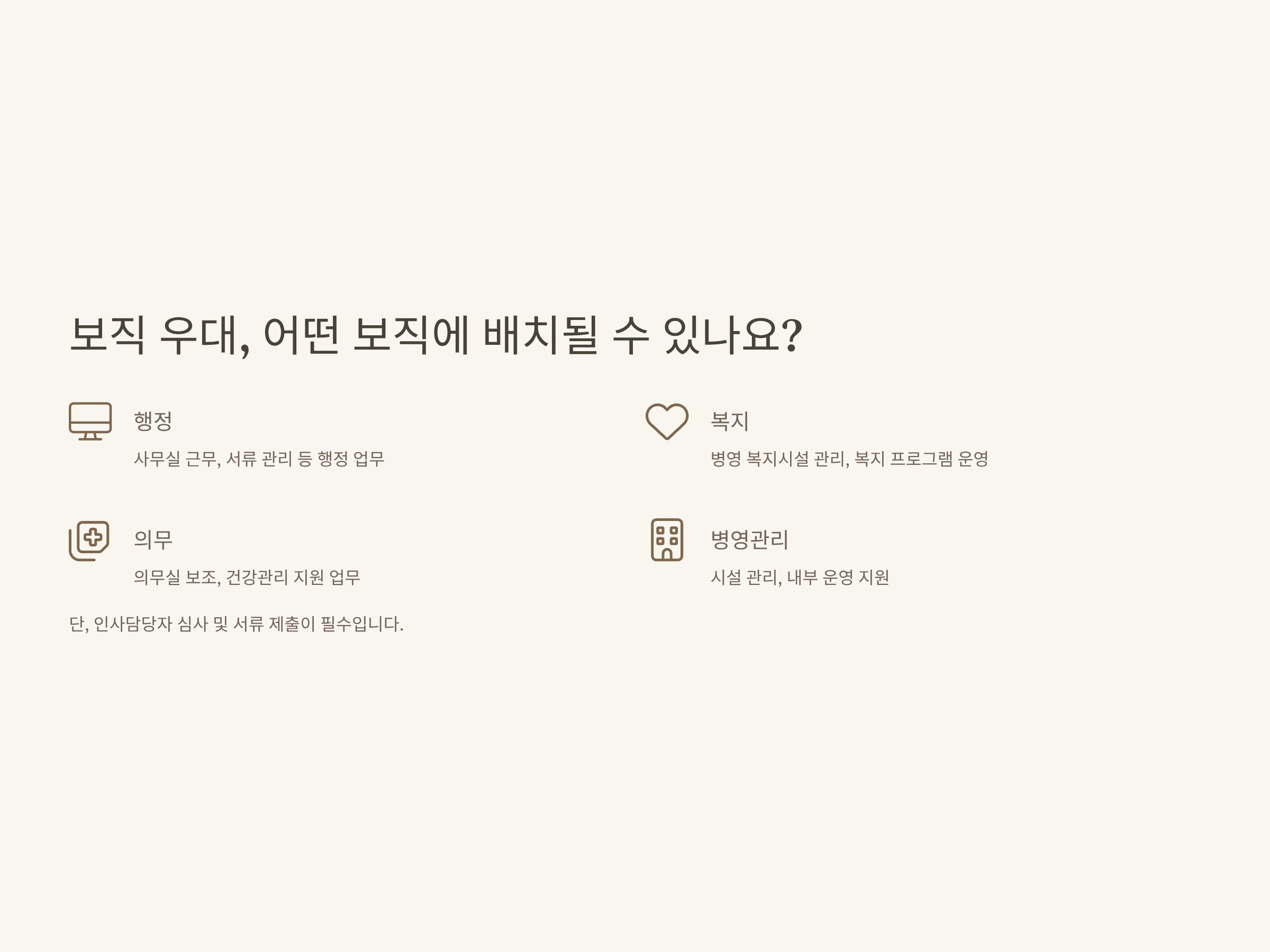 - 행정, 복지, 의무, 시설, 병영 등 선호 보직 우선 배치 가능