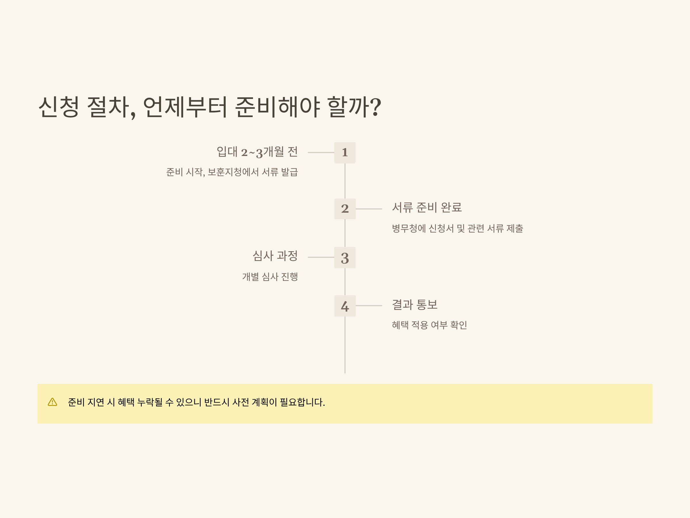 | 신청 절차 | 입영 전 2~3개월, 보훈지청·병무청 사전신청, 개별 심사 |