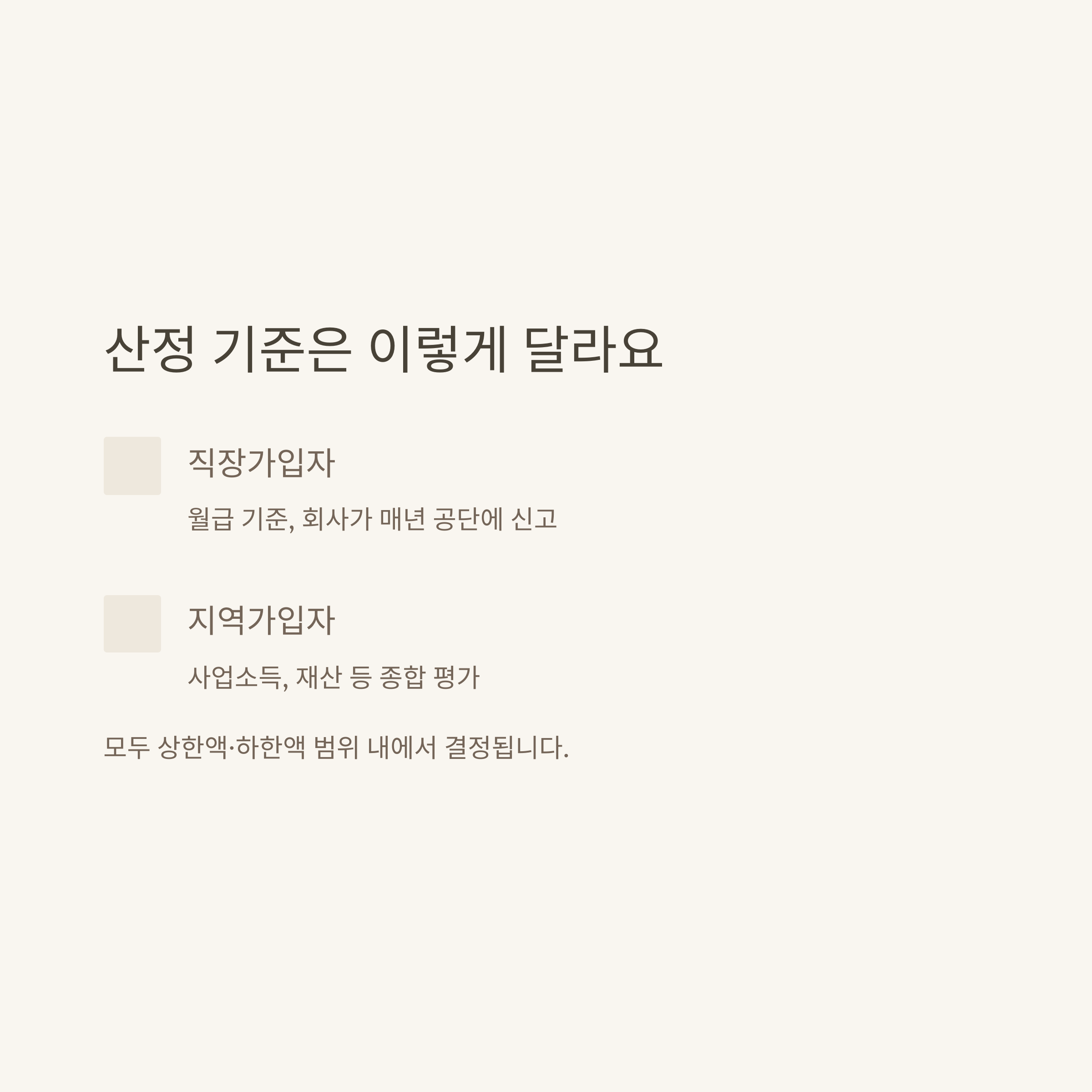 | 지역가입자 | 본인이 소득·재산 기준으로 산정 | 직업, 소득, 재산 등 복합 산출 |