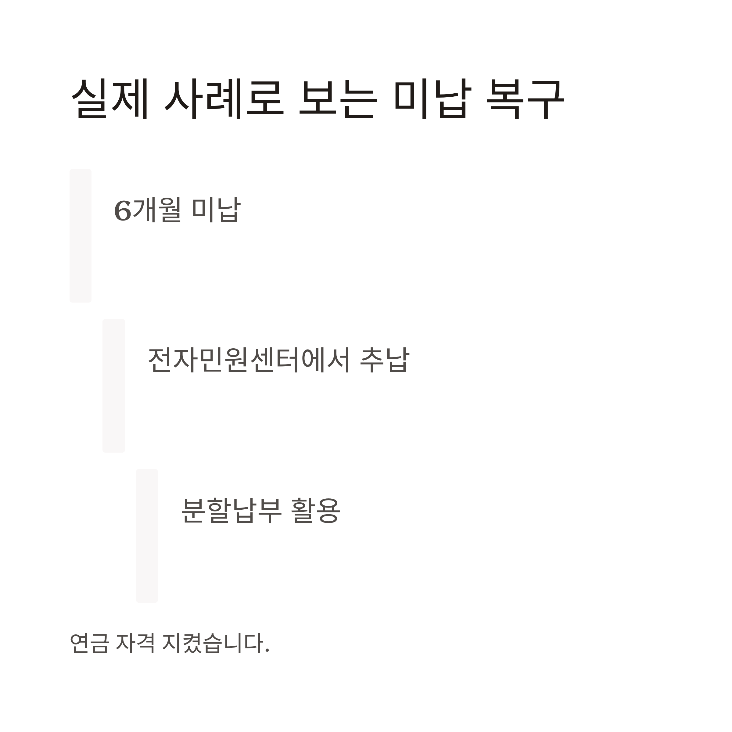 사례: 국민연금공단에 문의해 분할납부(6개월)를 신청했고, 약 3개월 내에 모두 납부 완료했습니다. 덕분에 체납자로 전환되지 않고, 압류 조치도 피할 수 있었어요.