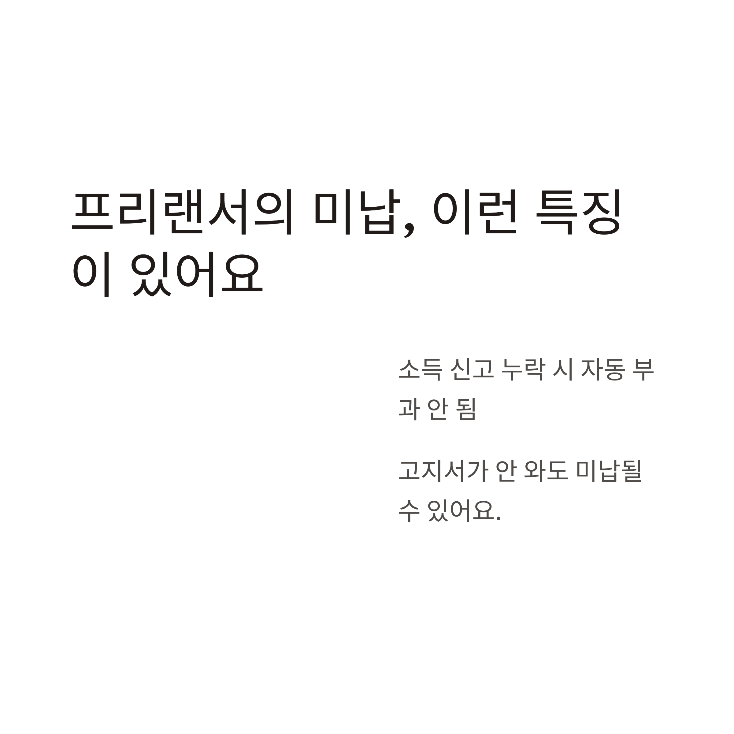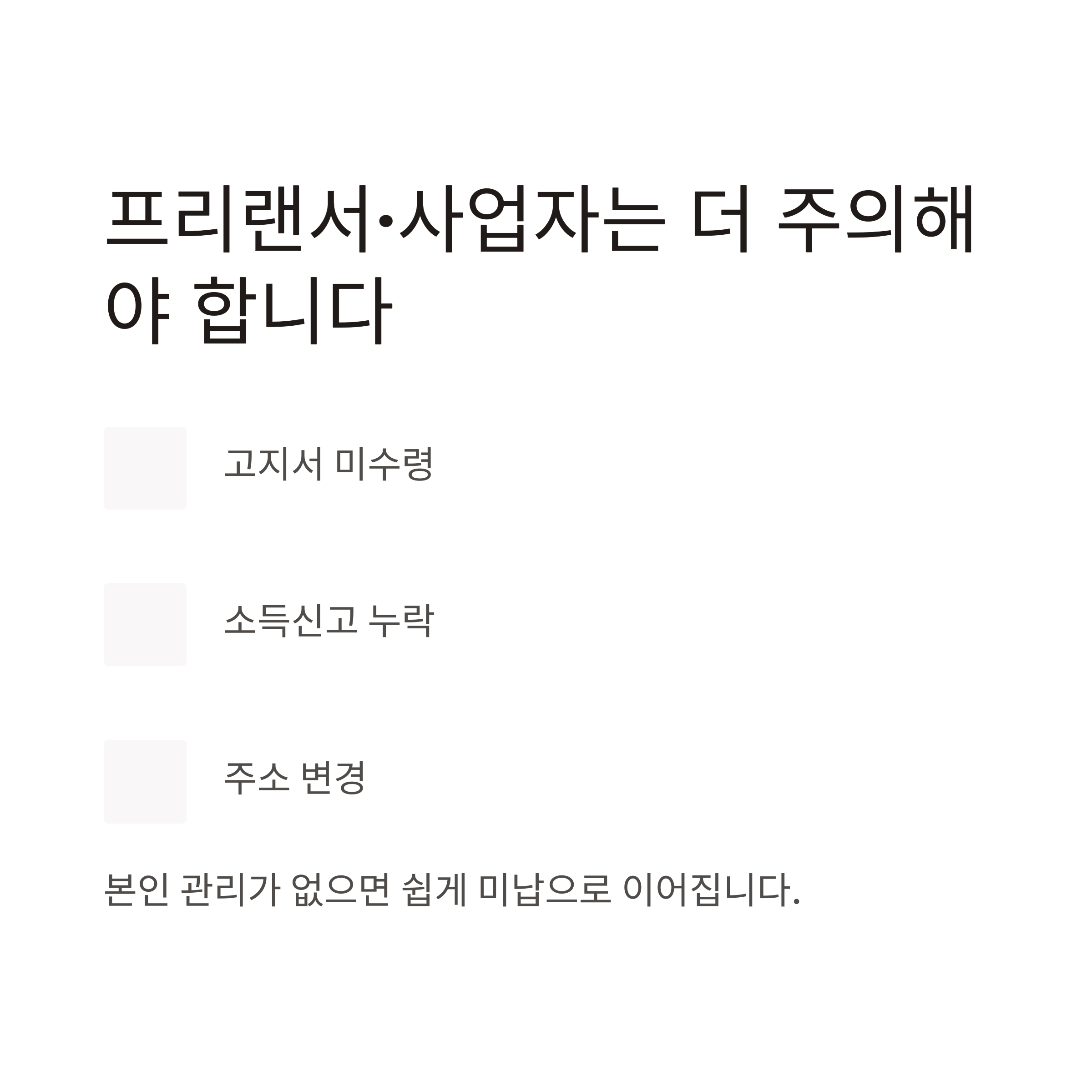 | 사업자/프리랜서 | 납부 자율성 강화 / 미납 시 체납 리스크 |