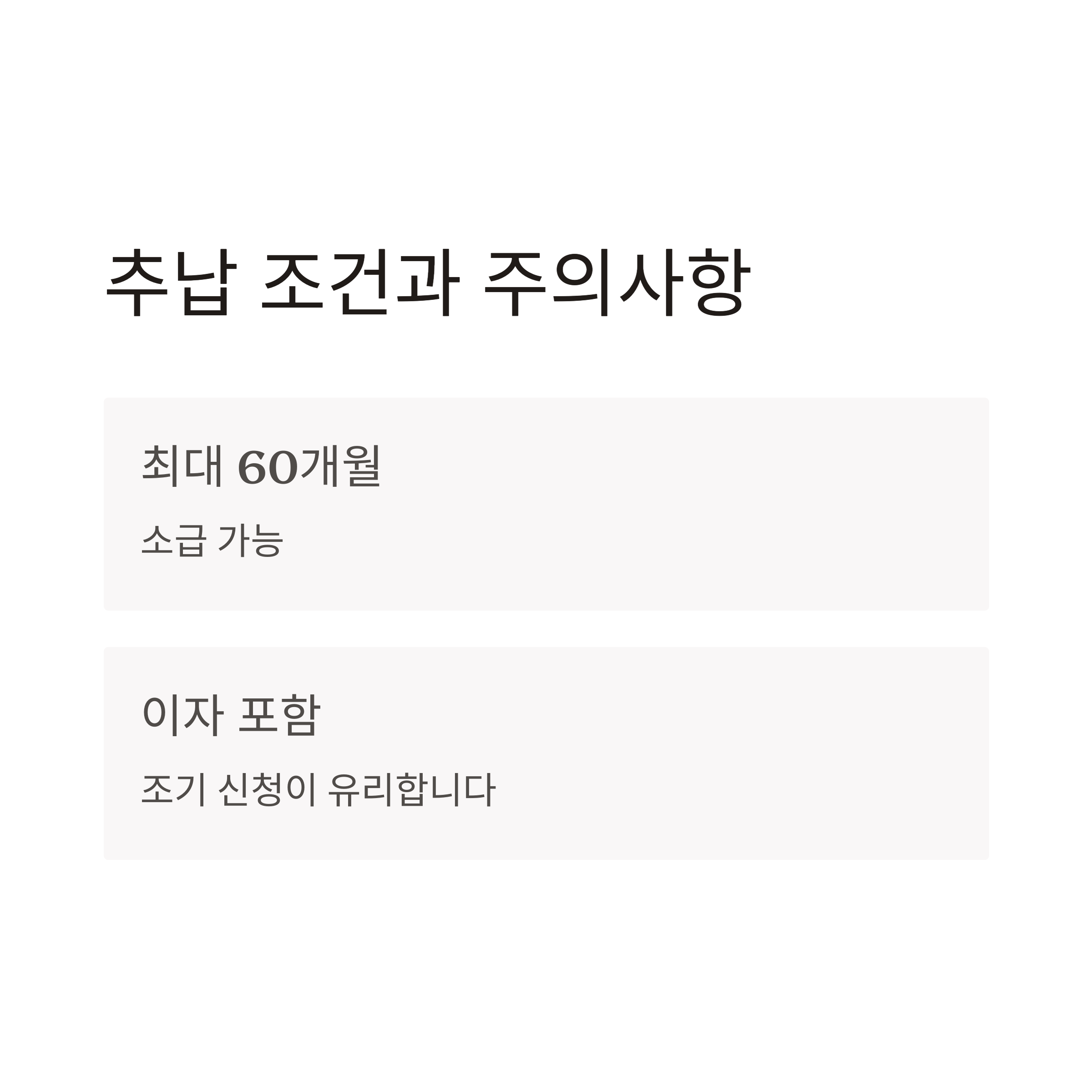 주의사항/팁: 추납은 ‘미납된 기간의 보험료 + 일정 이자’를 포함해 납부해야 하므로, 미납 기간이 길어질수록 비용이 증가합니다. 또한, 추납 가능 기간은 가입 형태에 따라 달라지기 때문에 반드시 미리 확인하시고, 추납 신청을 놓치지 마세요.