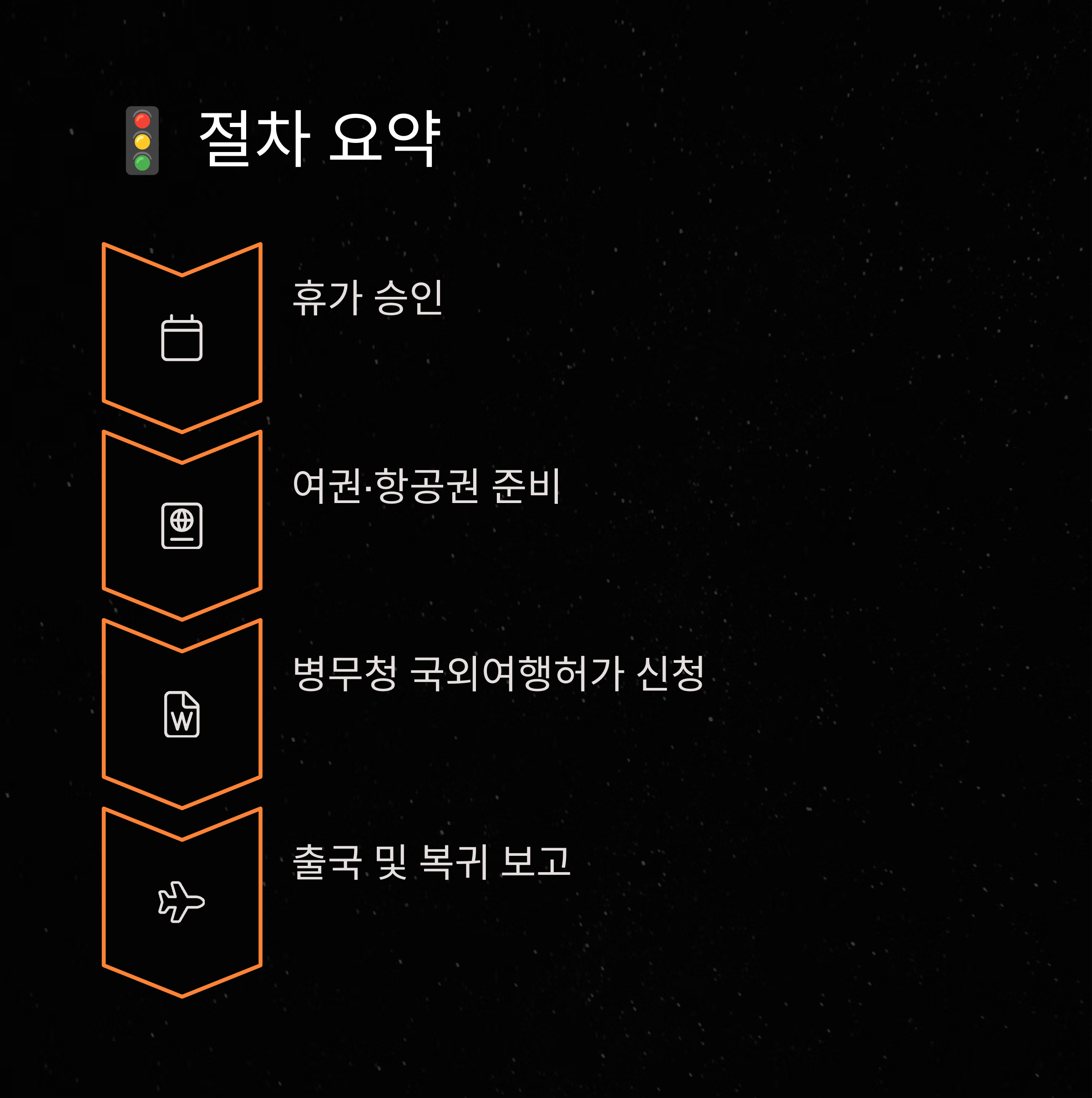 제가 실제로 해외여행을 갔던 절차를 정리하면 다음과 같습니다. 1단계: 휴가 승인 → 2단계: 여권 준비 → 3단계: 병무청 신고 → 4단계: 출국 순서로 진행되며, 군부대 사전 허가는 필수입니다.