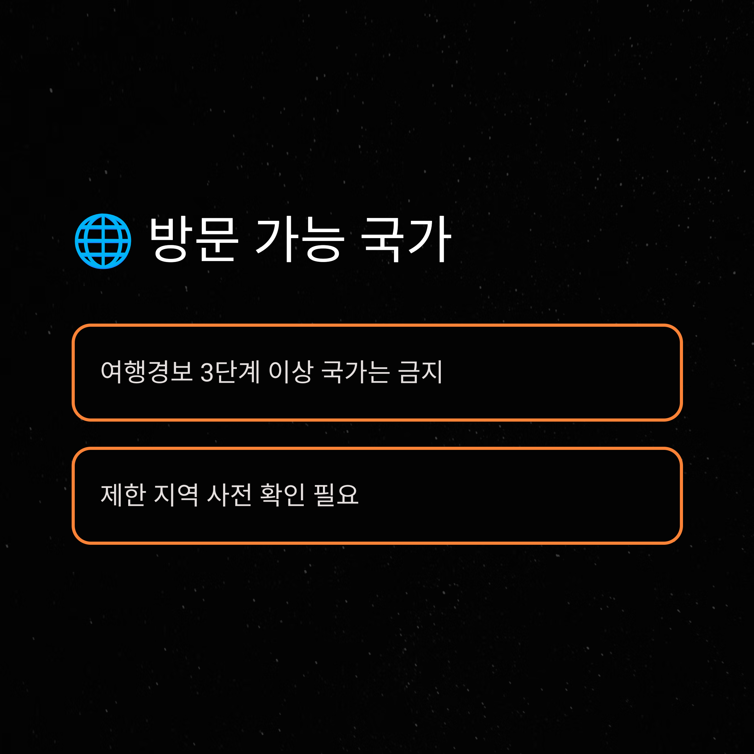 - 여행 금지 국가: 북한, 시리아, 아프가니스탄, 이라크 등