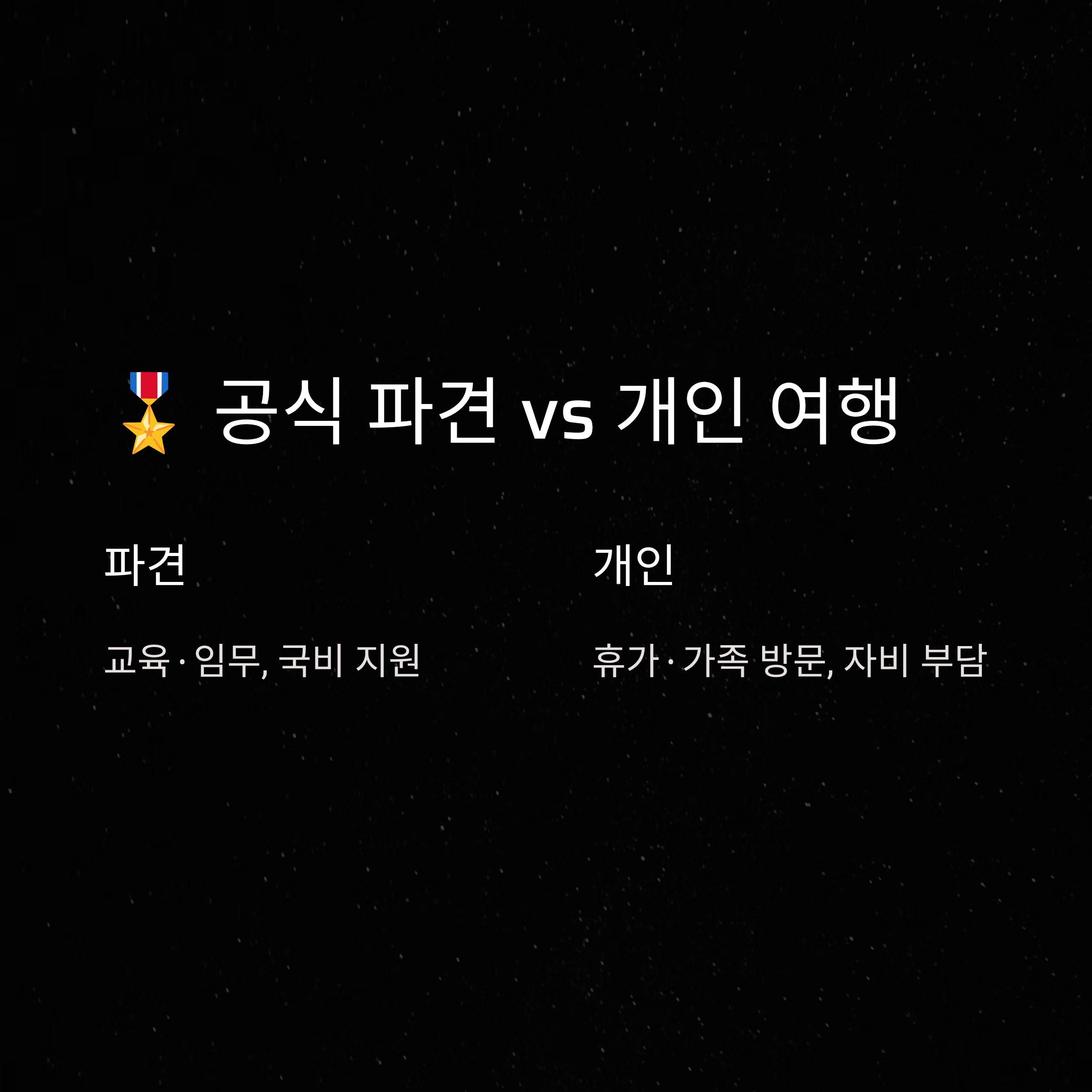 군인이 해외를 나가는 방식에는 공식 파견과 개인 여행이 있습니다. 제가 공보병으로 복무하던 중, 교육 파견을 다녀온 간부가 있었는데요. 그 분께 들은 내용과 개인적인 여행을 비교했을 때, 여러 점에서 절차와 책임이 다르다는 걸 알 수 있었습니다. 비교표: