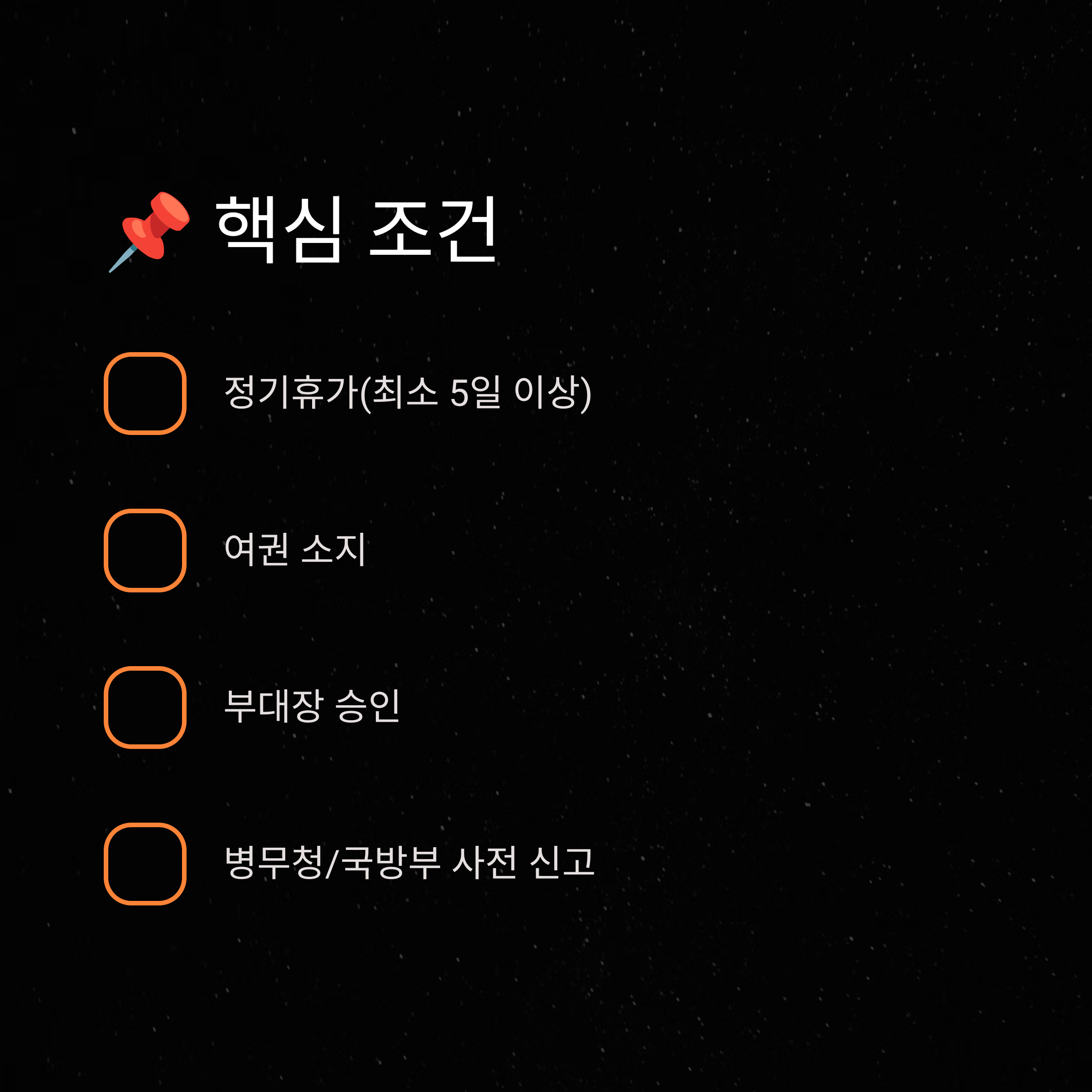 | 필수 조건 | 부대 허가, 병무청 국외여행허가, 여권 소지 |