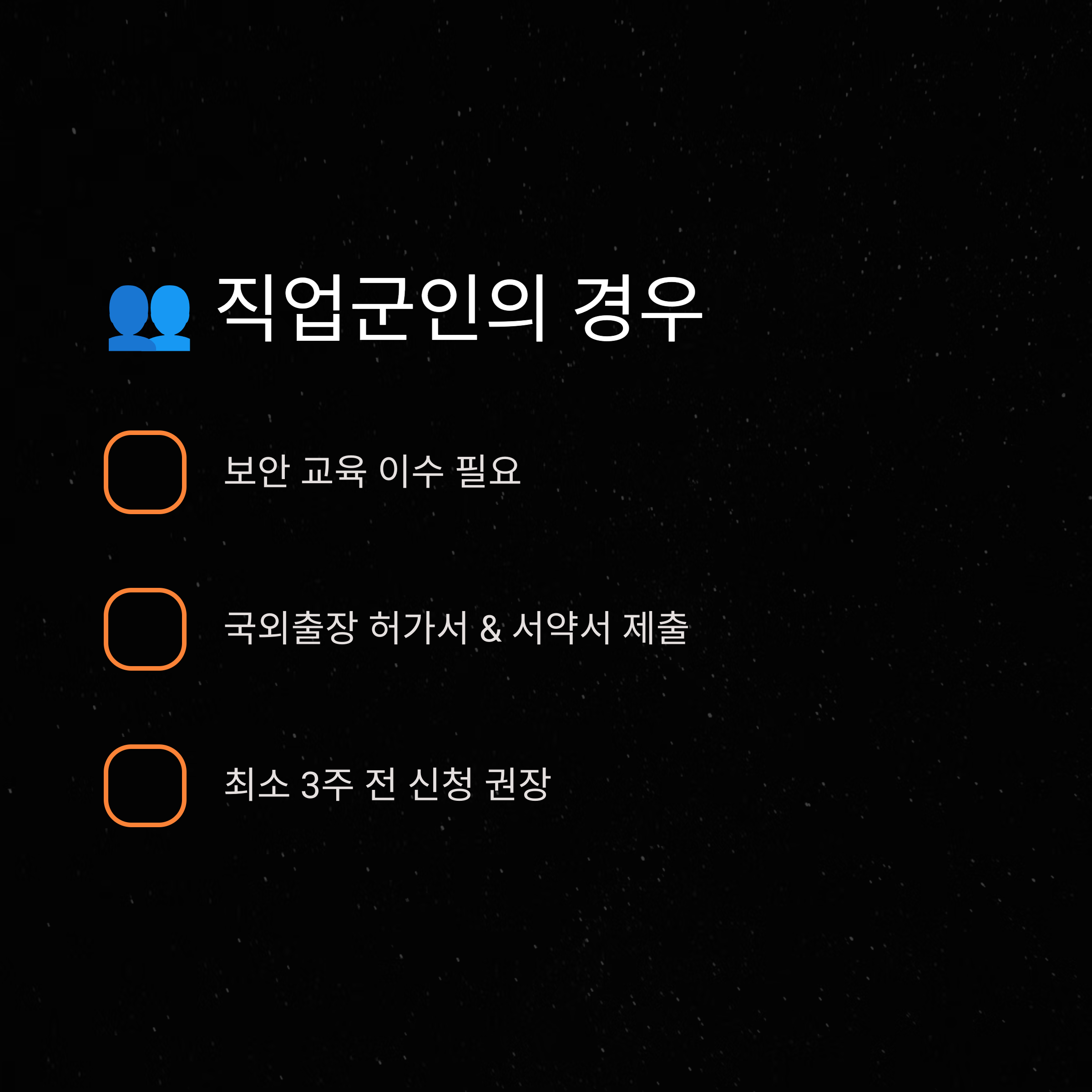 직업군인의 경우 여행 국가, 체류 목적에 따라 별도의 심사 기간이 필요할 수 있으므로 최소 3주 전에는 신청하는 것이 안전합니다.