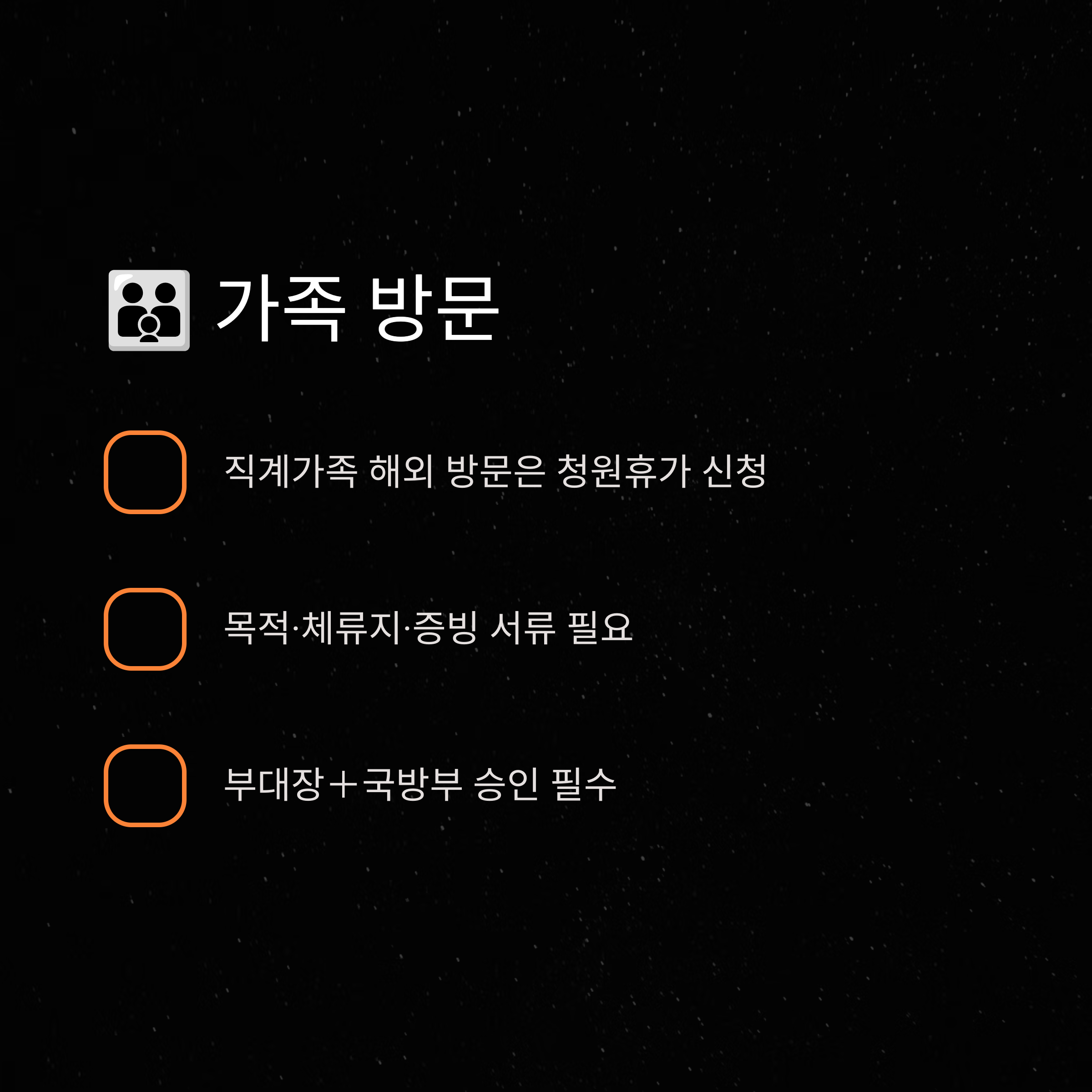 “군 복무 중 해외에 있는 가족을 방문할 수 있을까?”라는 질문을 많이 받는데요, 결론은 가능하지만 조건부 허가입니다. 저 역시 외삼촌이 해외에 거주하셔서 고민했던 적이 있었어요. 이 경우엔 일반 여행보다는 가족 방문 목적의 청원휴가로 신청하는 게 유리합니다. 조건: