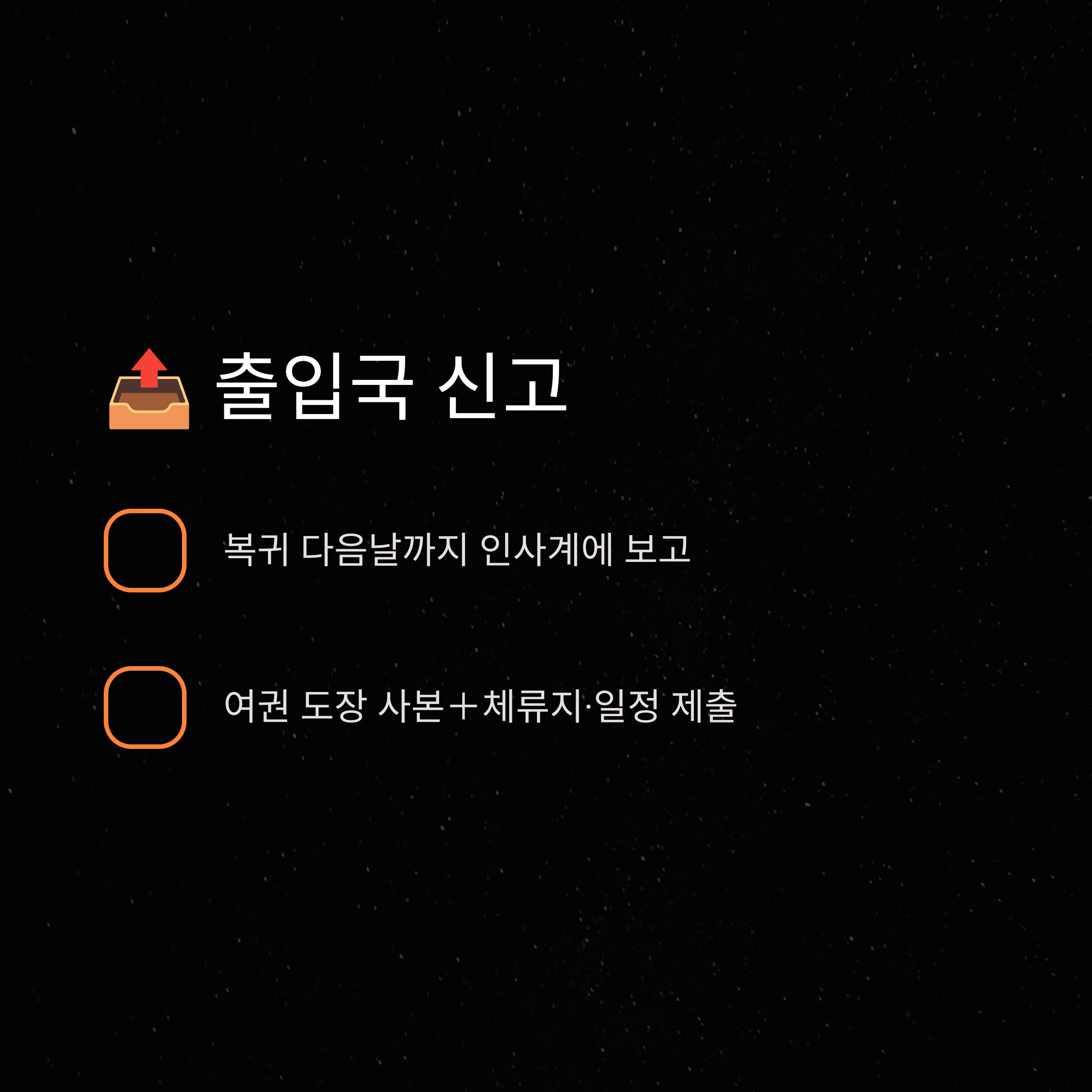 - 복귀 다음날까지 인사계 혹은 행정반에 입출국 보고