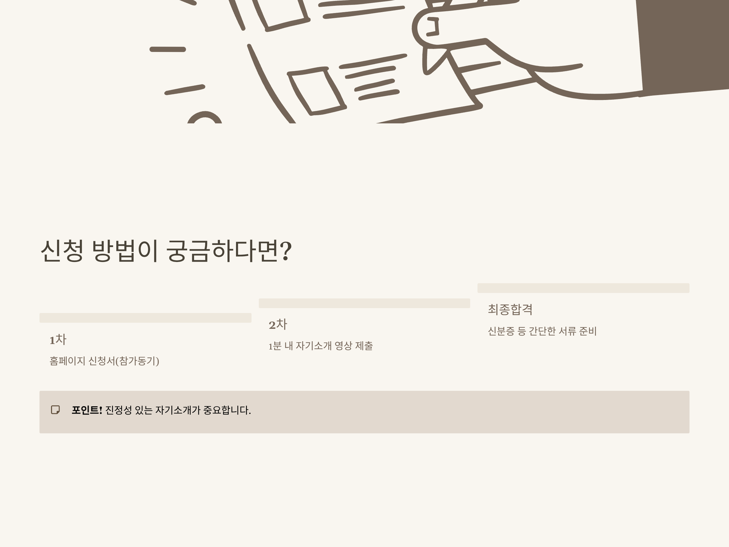 | 신청방법 | 1차 온라인 신청서 → 2차 자기소개 영상(합격자 한정) |