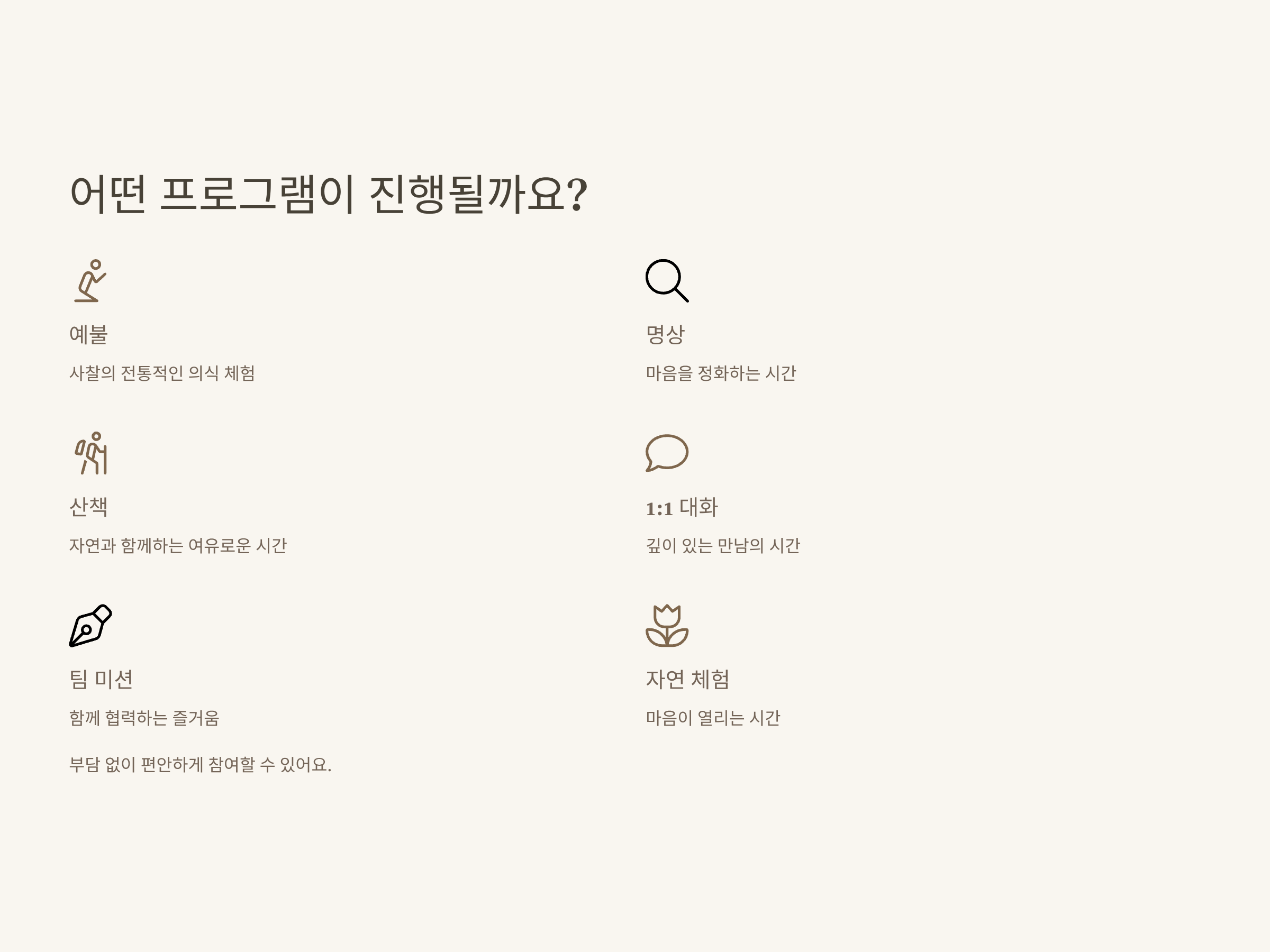| 프로그램 | 예불·명상·산책·차담·팀 미션 등 자연 속 소통·교감 중심 |