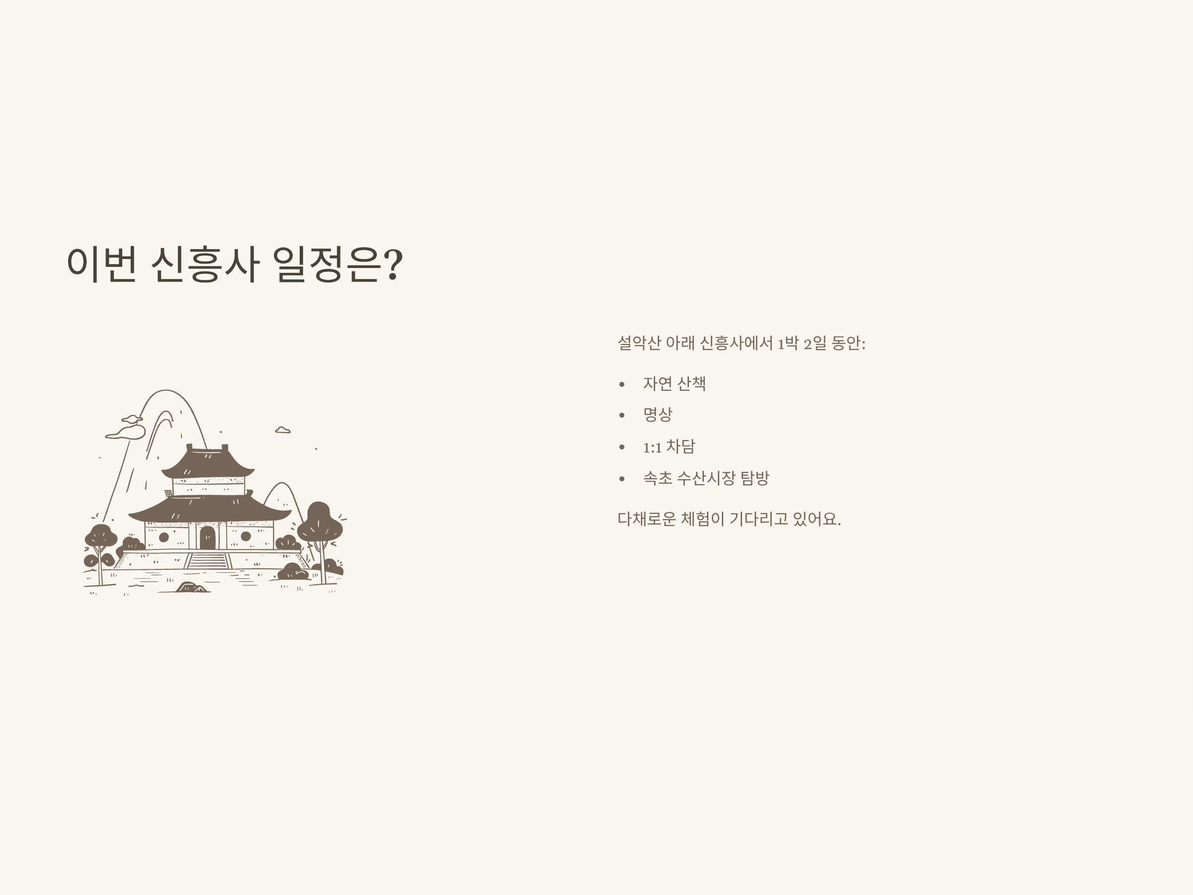 이번 신흥사 편은 설악산 아래에서 1박 2일로 진행되며, 영랑호 산책, 사찰 명상, 속초 수산시장 탐방 등 다양한 체험을 할 수 있어요. 종교와 상관없이 누구나 신청할 수 있는 것이 매력적입니다.
