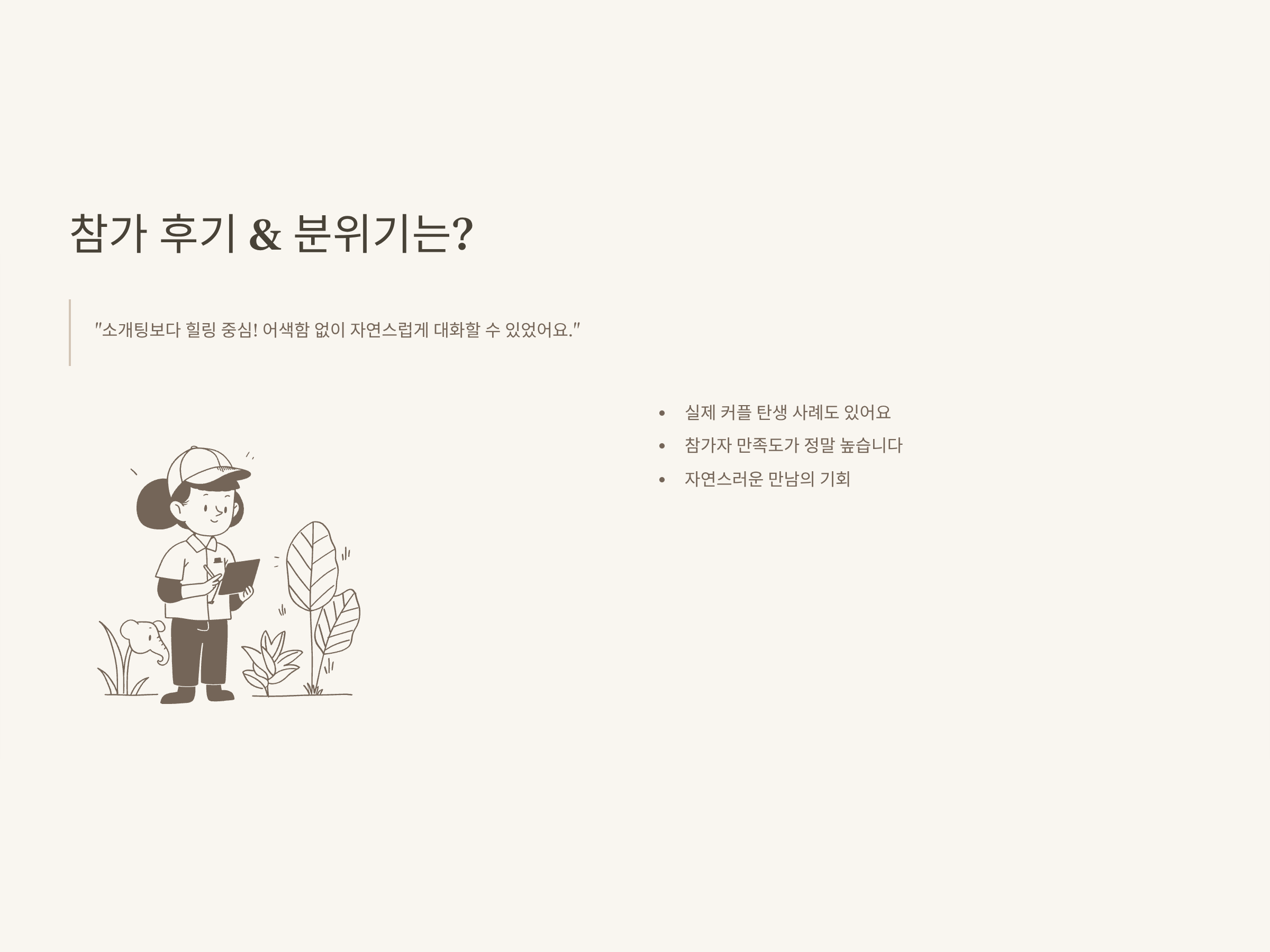 직접 참가하면서 인상 깊었던 점은, 소위 말하는 소개팅의 부담이 전혀 없고, ‘같이 자연을 걷고, 차 한잔하며 대화 나누는’ 그 자체만으로도 힐링이 된다는 것입니다.