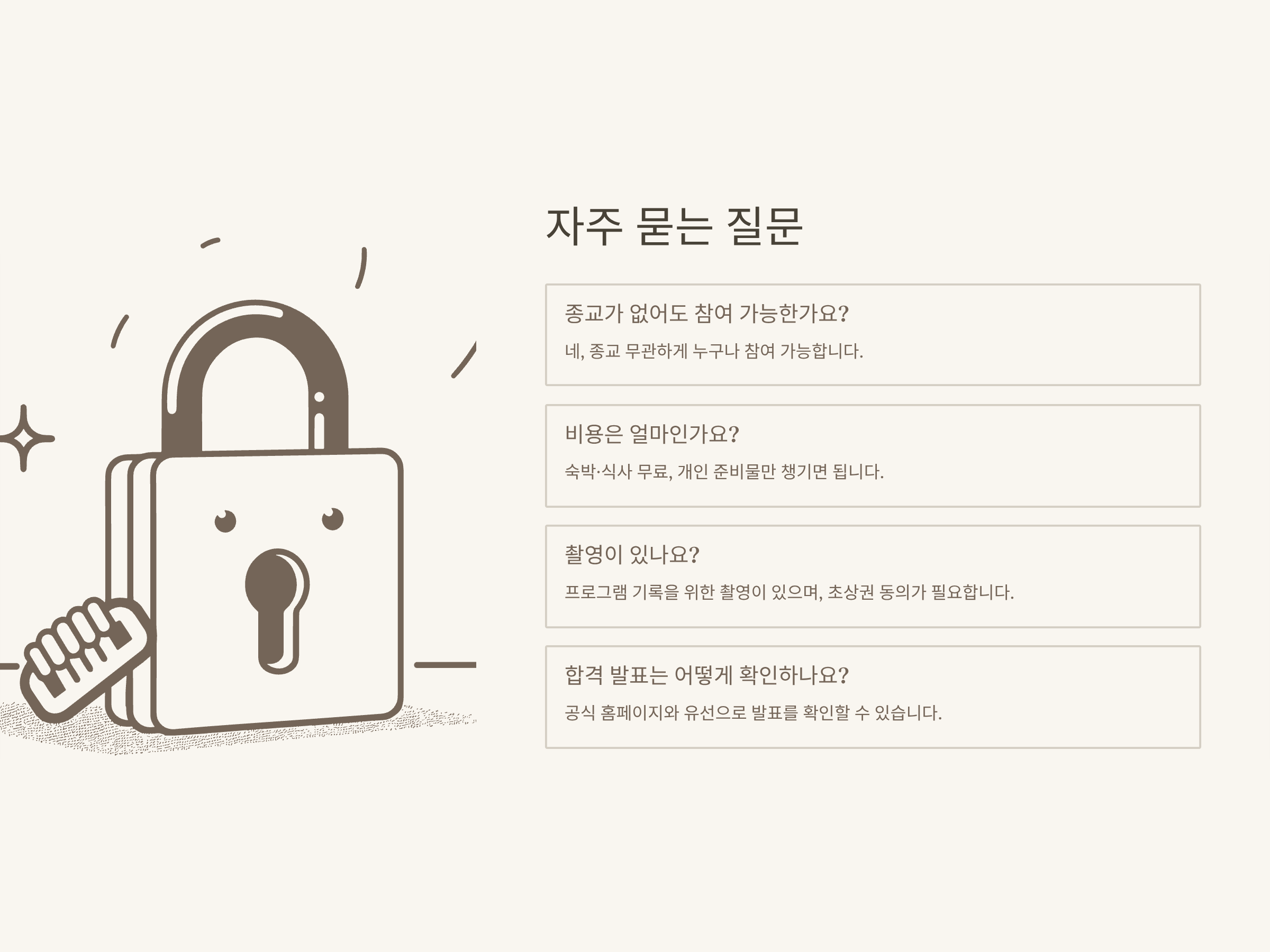 특별히 종교를 따지지 않으며, 참가비도 무료라 부담 없이 신청할 수 있어요.