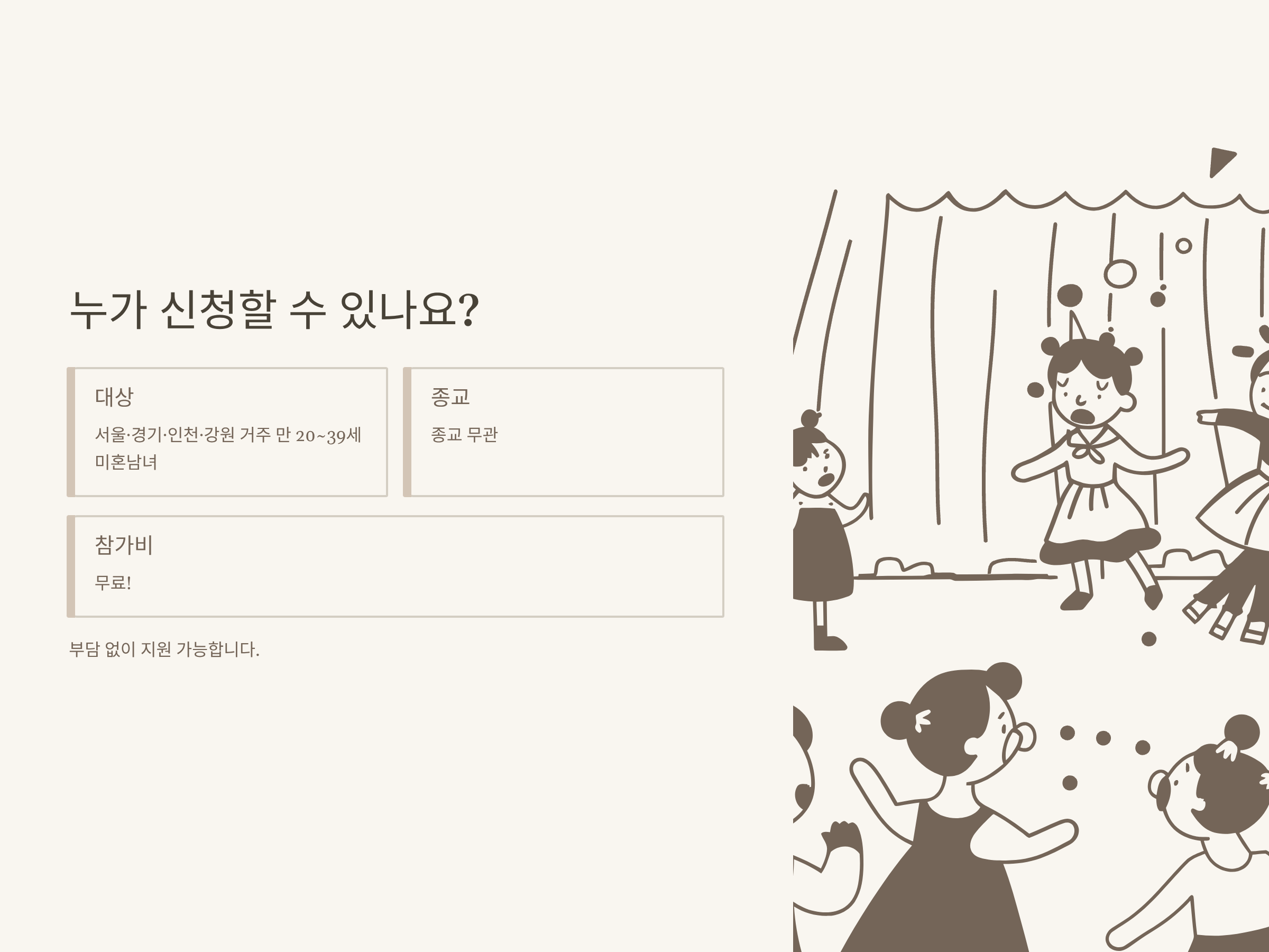 | 신청대상 | 서울·경기·인천·강원 거주 2030 미혼남녀(남녀 각 10명 내외) |