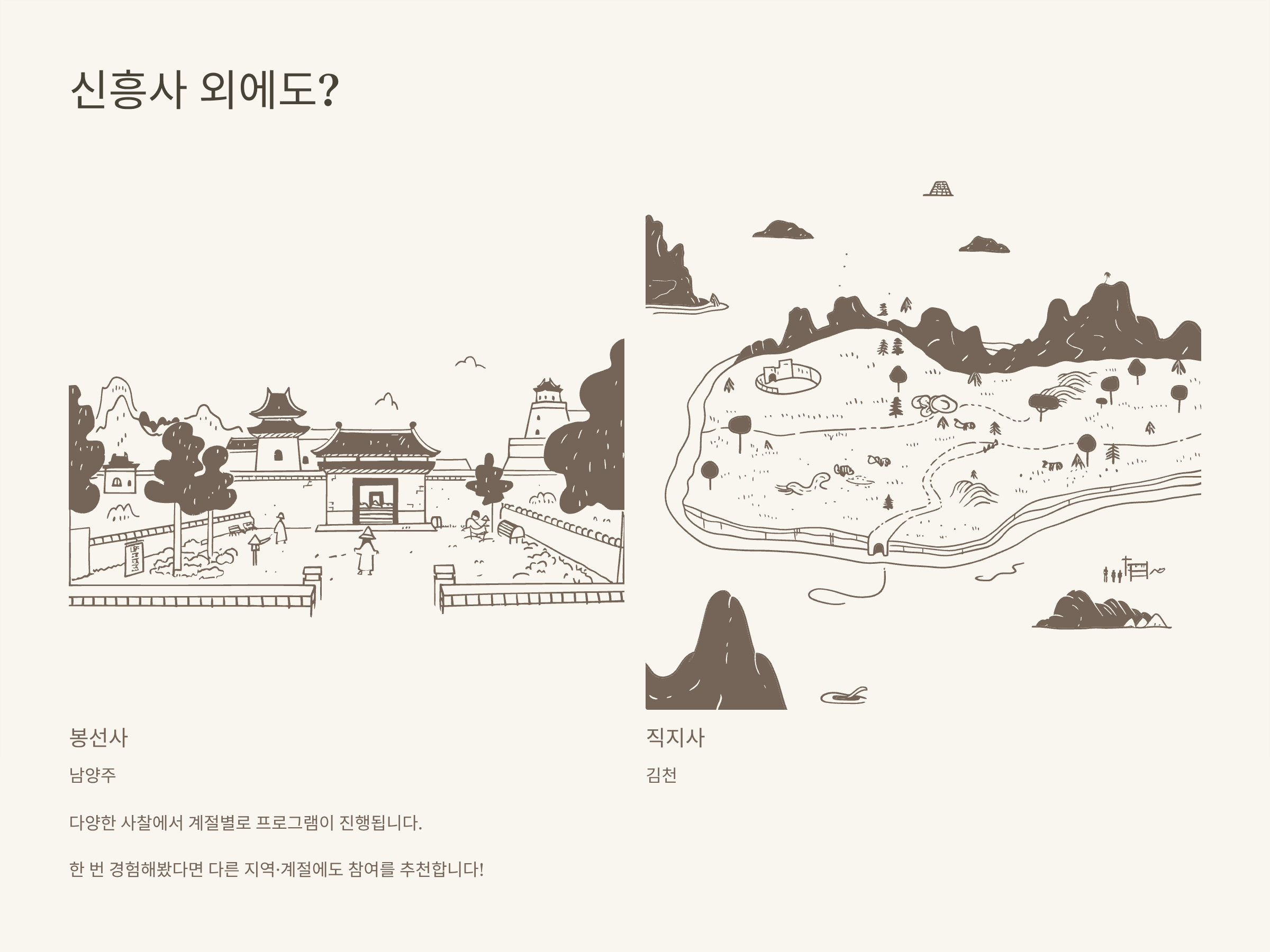 | 진행장소 | 신흥사(설악산), 봉선사(남양주), 직지사(김천) 등 계절별 사찰 |