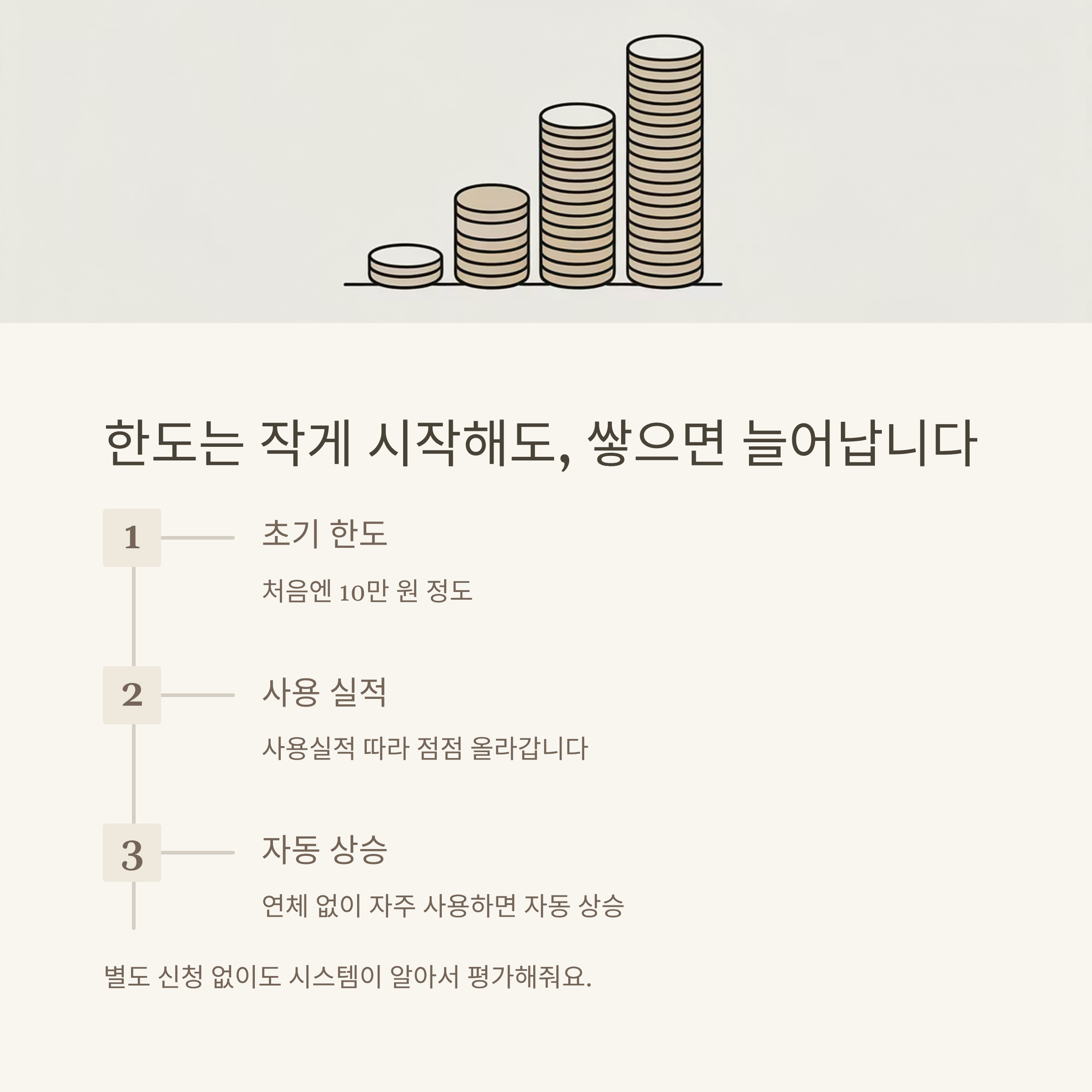 실제로 저는 처음 2개월 동안 연체 없이 소액 결제를 자주 하니까, 시스템에서 자동으로 한도를 올려주더라고요. 별도의 신청 없이 자동 상승됩니다.