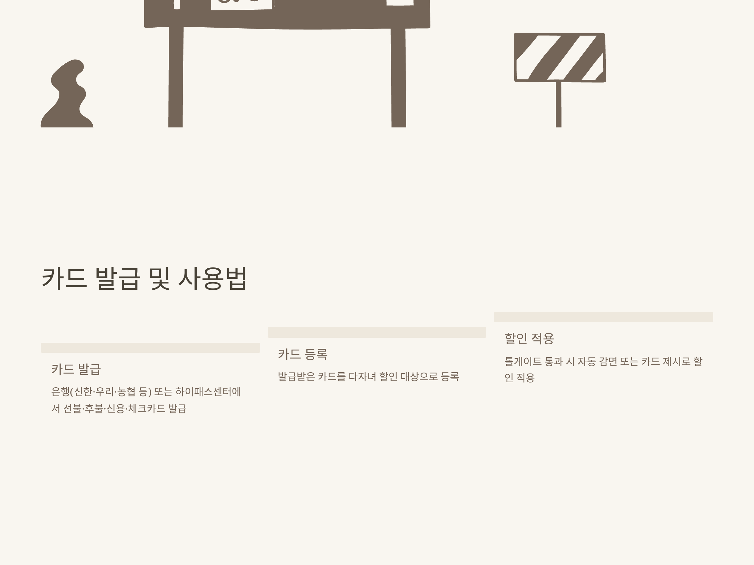 - 일반(현금) 톨게이트 통과 시에는 카드 제시로 할인 가능(일부 구간만 적용)