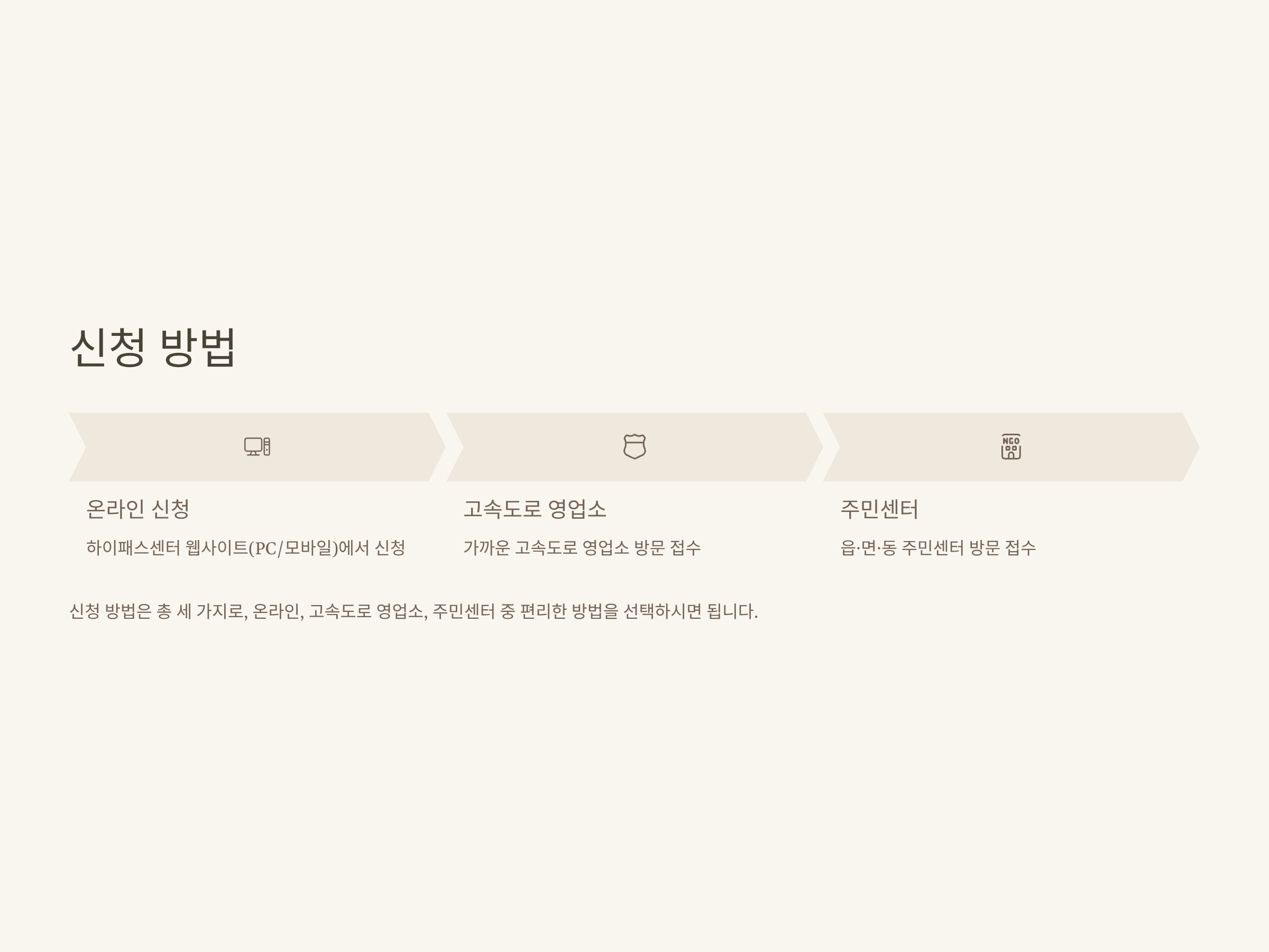 | 신청방법 | 하이패스센터 온라인/영업소, 주민센터 방문 |