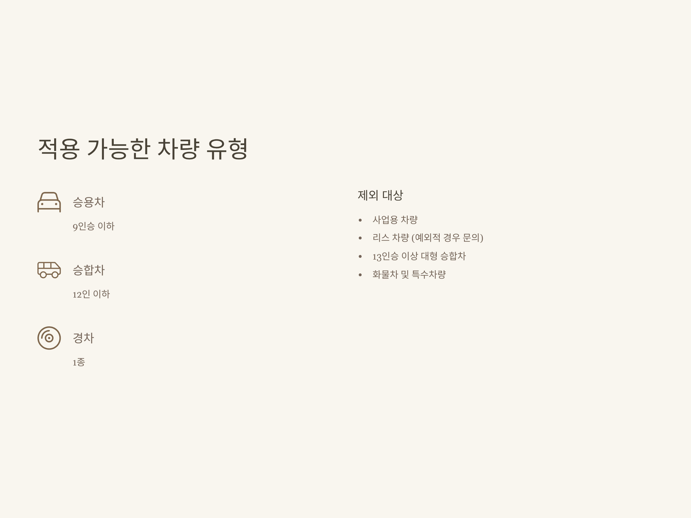 | 적용차량 | 승용차, 12인 이하 승합차, 경차(1대 한정) |