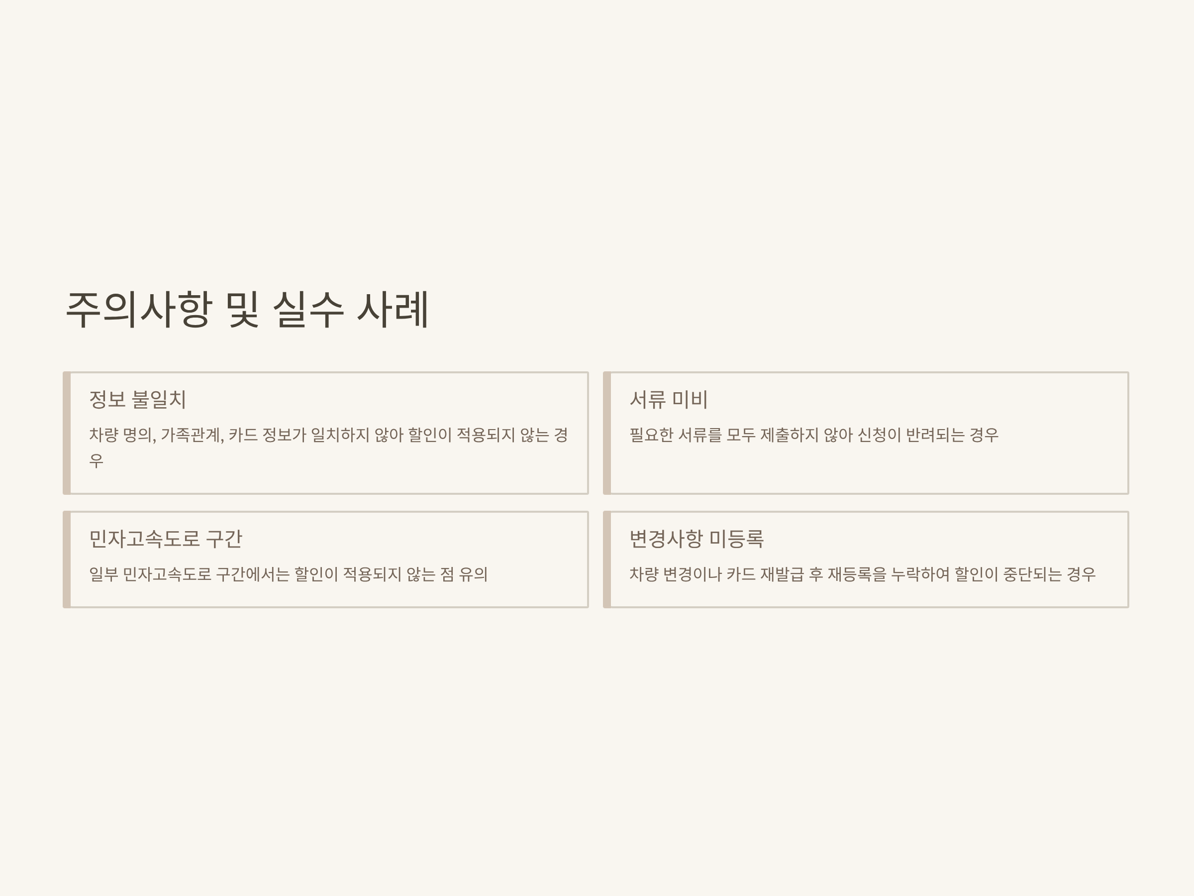| 할인누락사례 | 명의·차량 미일치, 카드 미등록 시 할인 안 됨 |