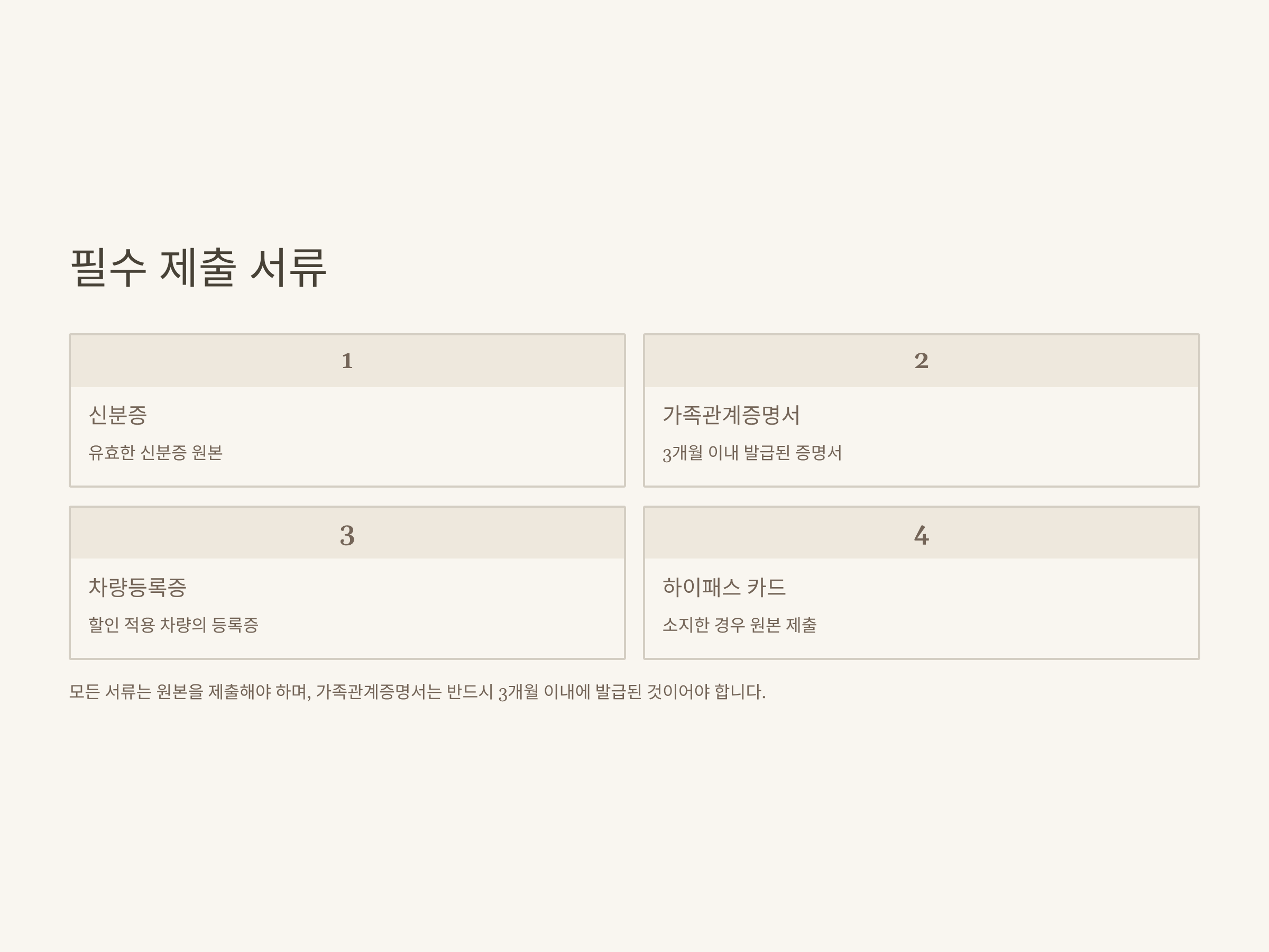 | 필수서류 | 신분증, 가족관계증명서, 차량등록증, 하이패스 카드 |