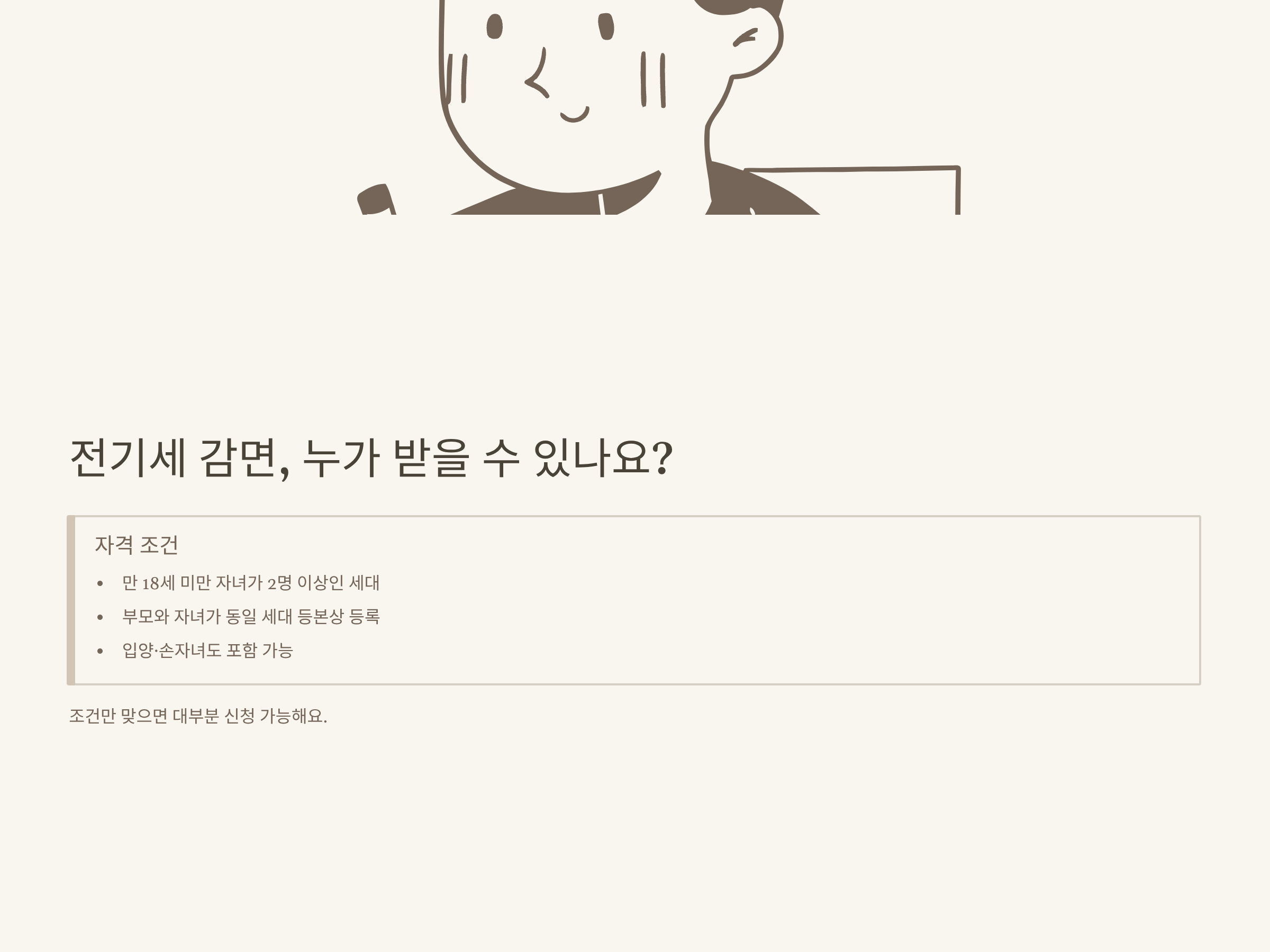 다자녀 전기세 감면 대상이 되려면 정확히 어떤 기준을 충족해야 하는지, 저도 실제 신청 전 제일 먼저 확인했습니다. 우선 2024년 기준, 2자녀 이상(만 18세 미만)이면 감면 대상이 됩니다. 이때 ‘2자녀 전기세 감면’이라고도 불리지만, 실제로는 자녀가 둘이든 셋이든 모두 동일하게 혜택을 받을 수 있습니다.